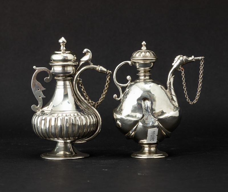 Due piccole fiasche d’argento con coperchio e beccuccio con chiusura a catenina, India, XIX secolo