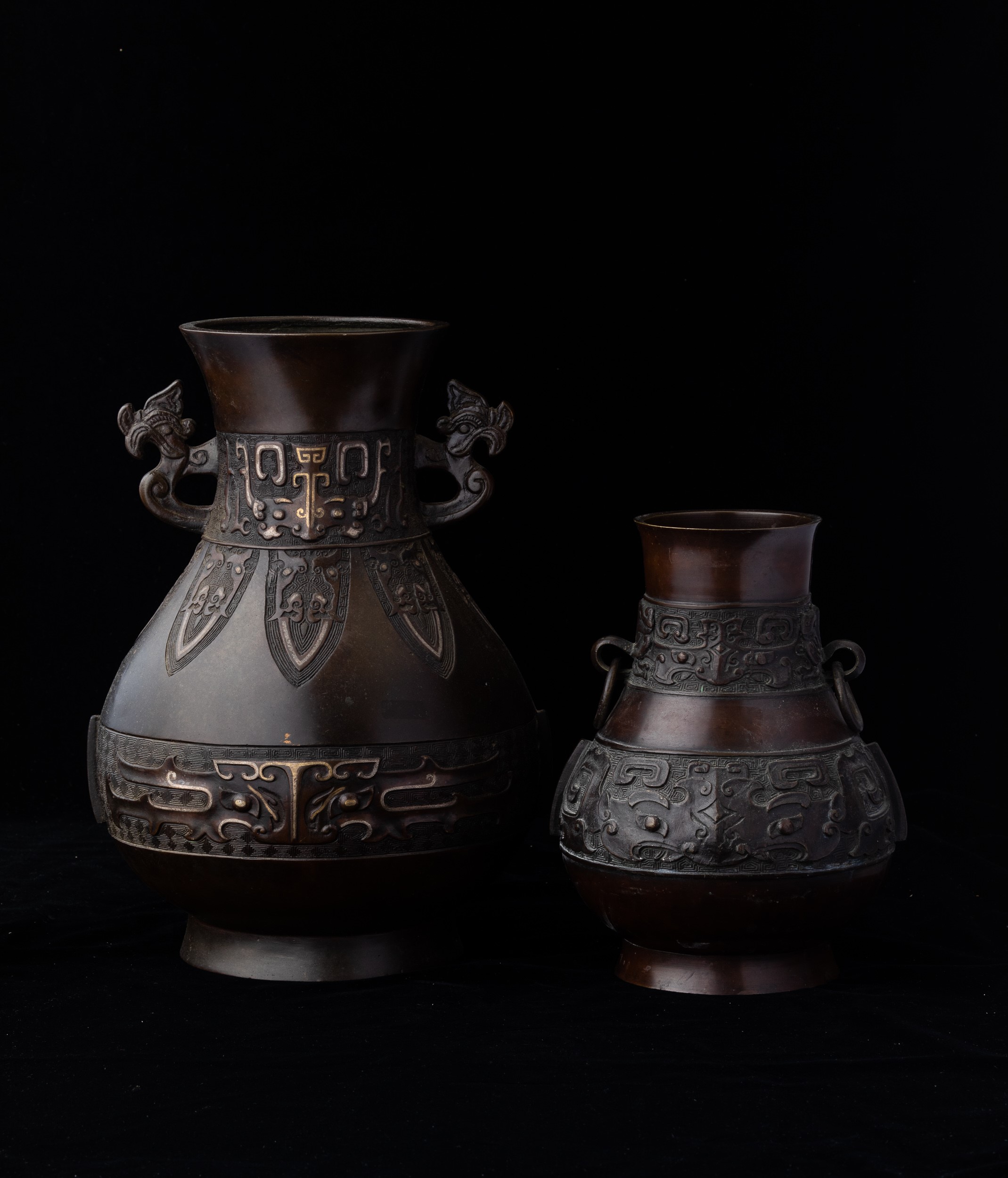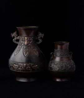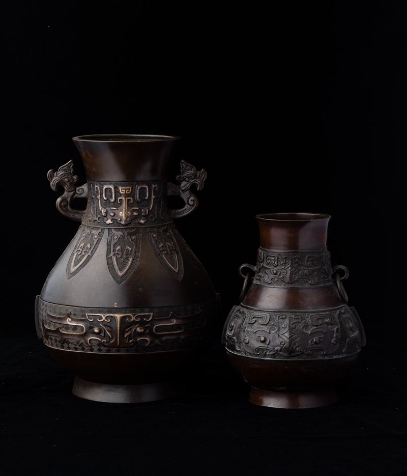 Due vasi in bronzo con anse e decori d'ispirazione arcaica, Cina, Dinastia Qing, XIX secolo