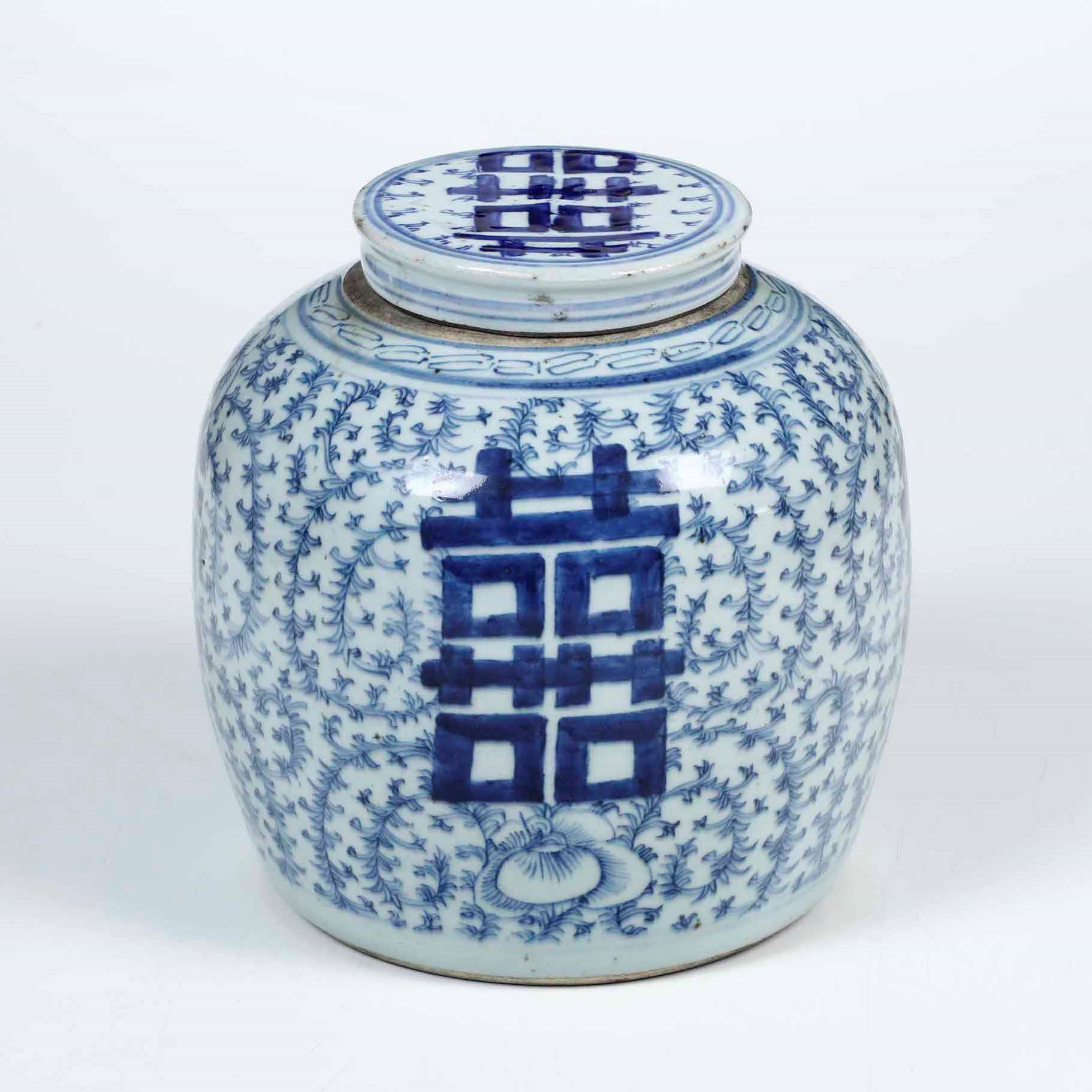 Potiche in porcellana bianca e blu con ideogramma e decori vegetali, Cina, Dinastia Qing, XIX secolo