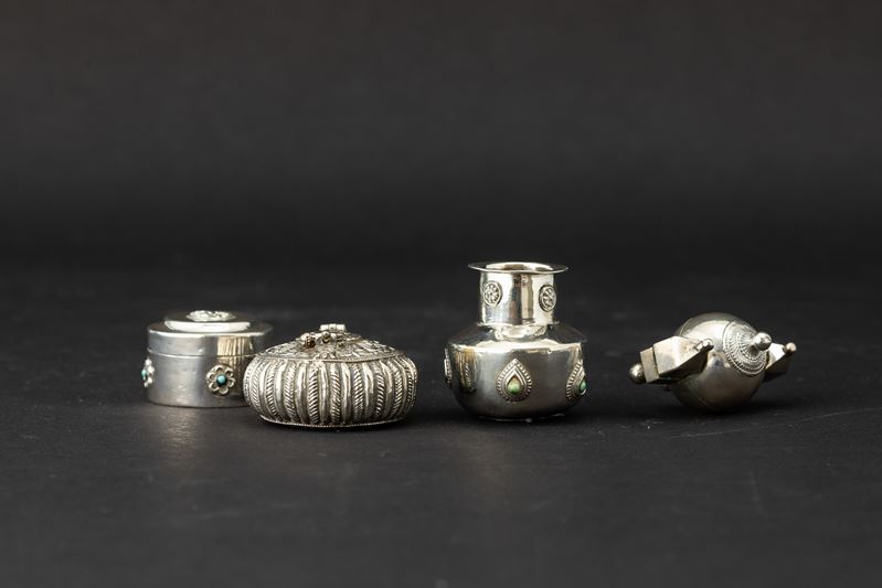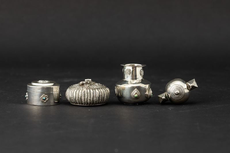 Quattro piccoli contenitori in argento, India, XIX secolo