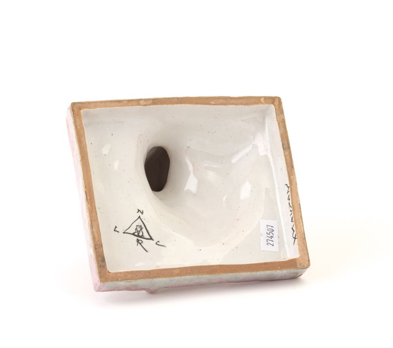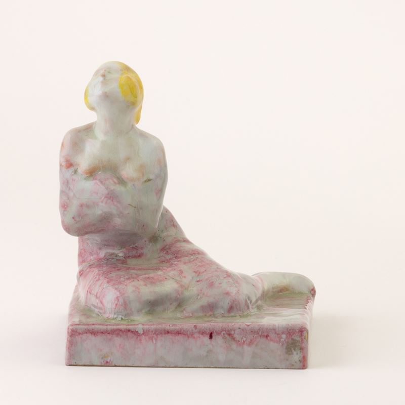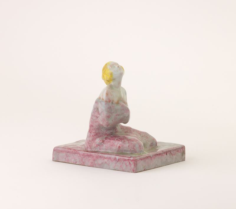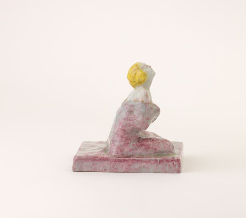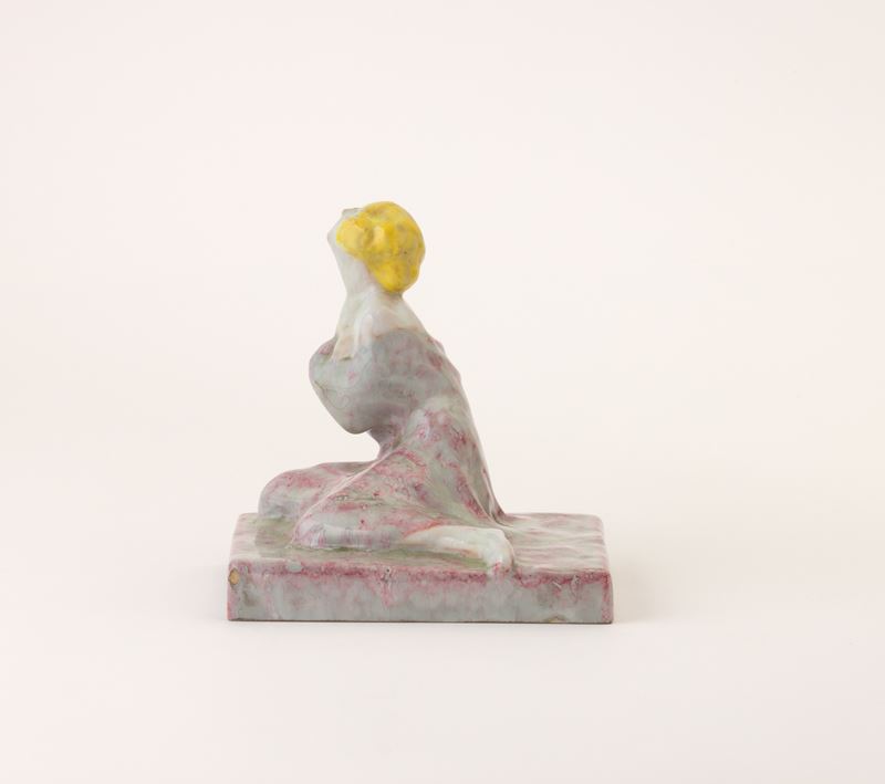 Figura di donna in ceramica con decoro in policromia su base rettangolare.