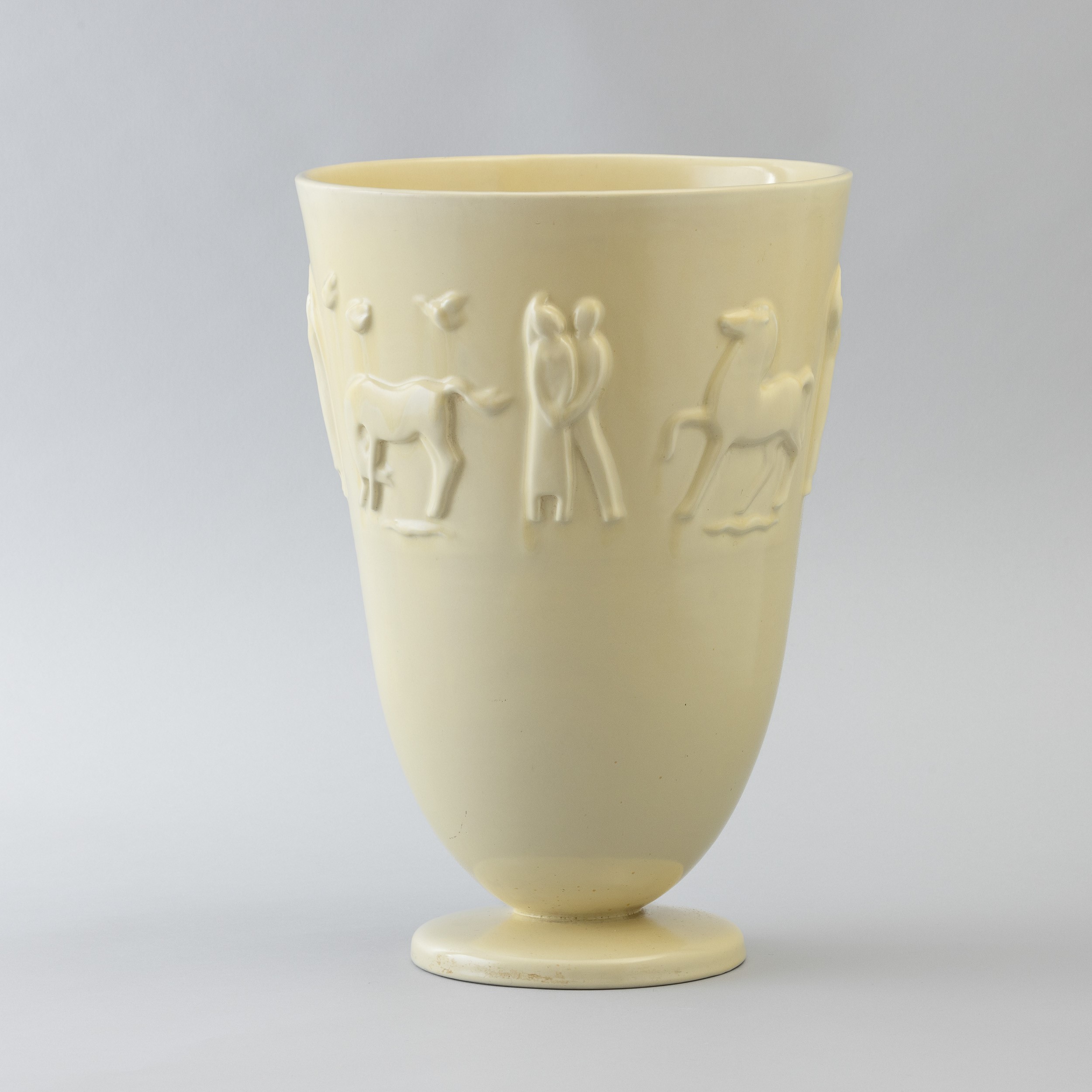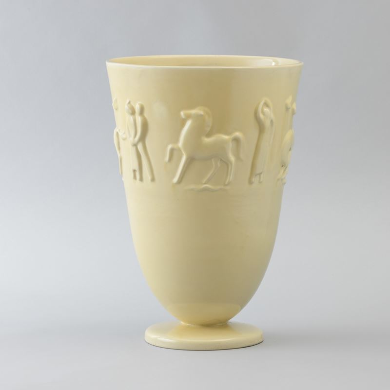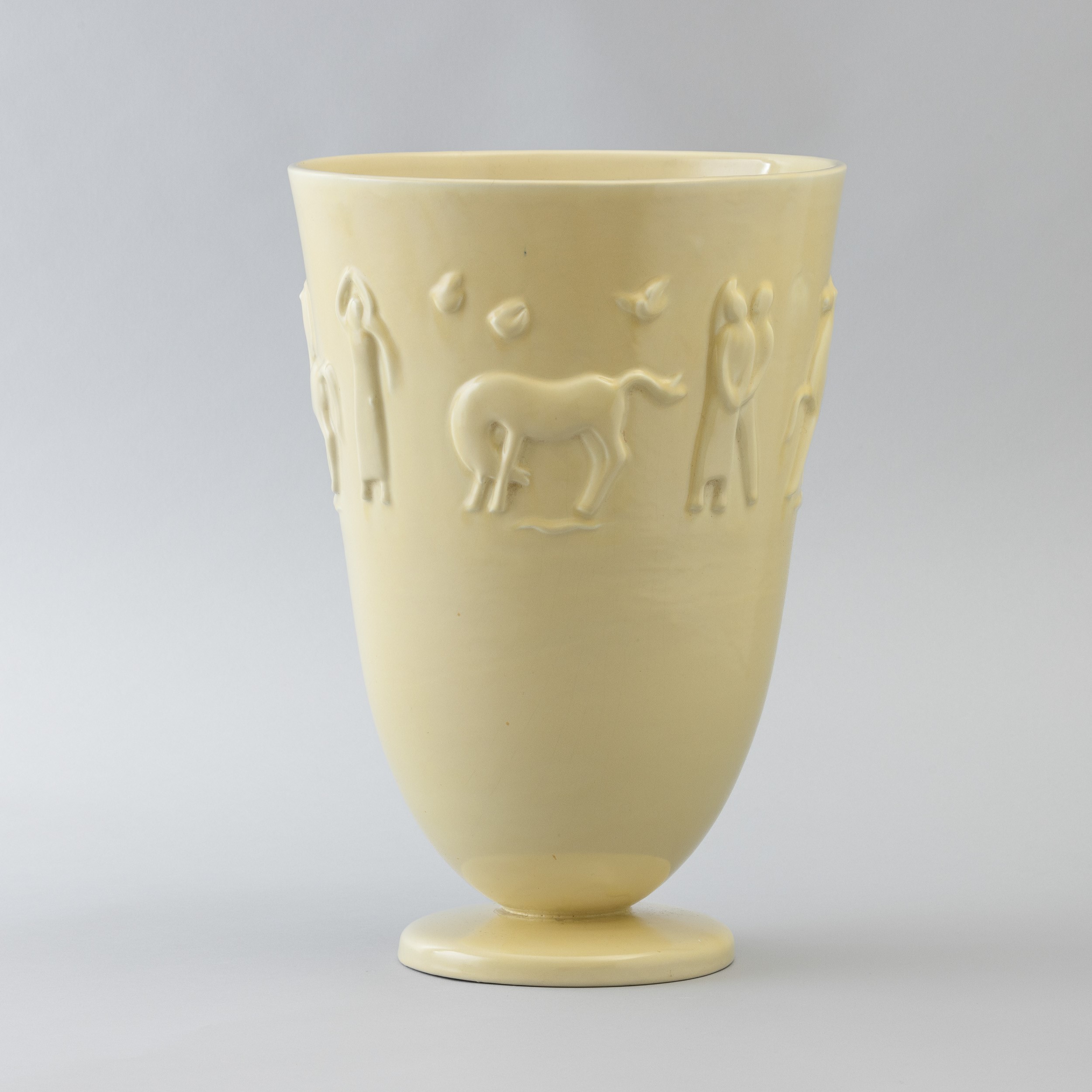 Vaso troncoconico su base circolare in terraglia a colaggio con figure a rilievo.