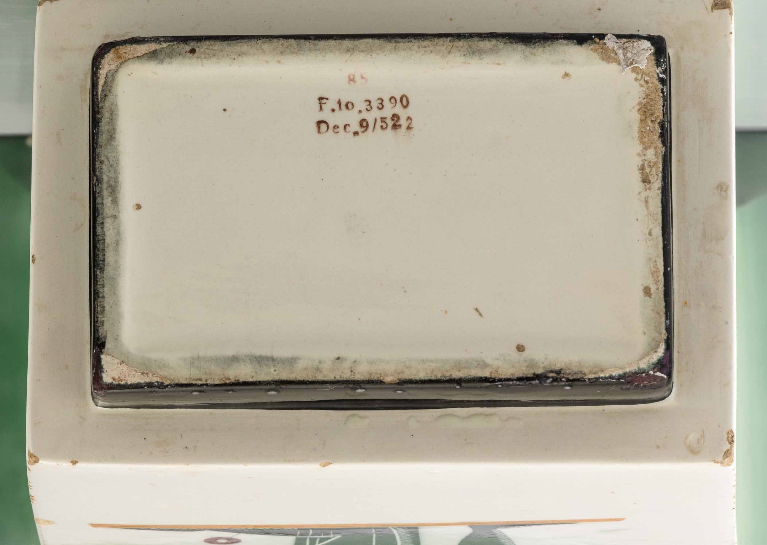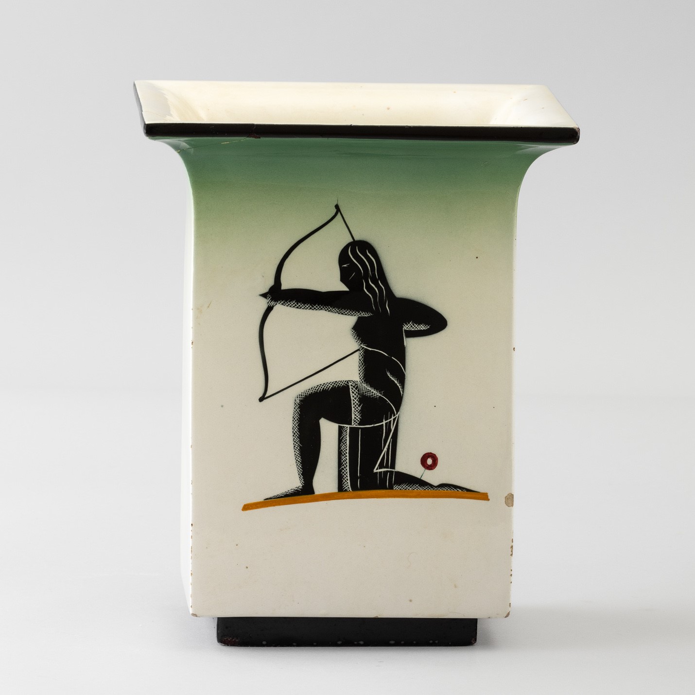 Vaso a base rettangolare con collo svasato in ceramica con decoro di arciere all'aerografo.