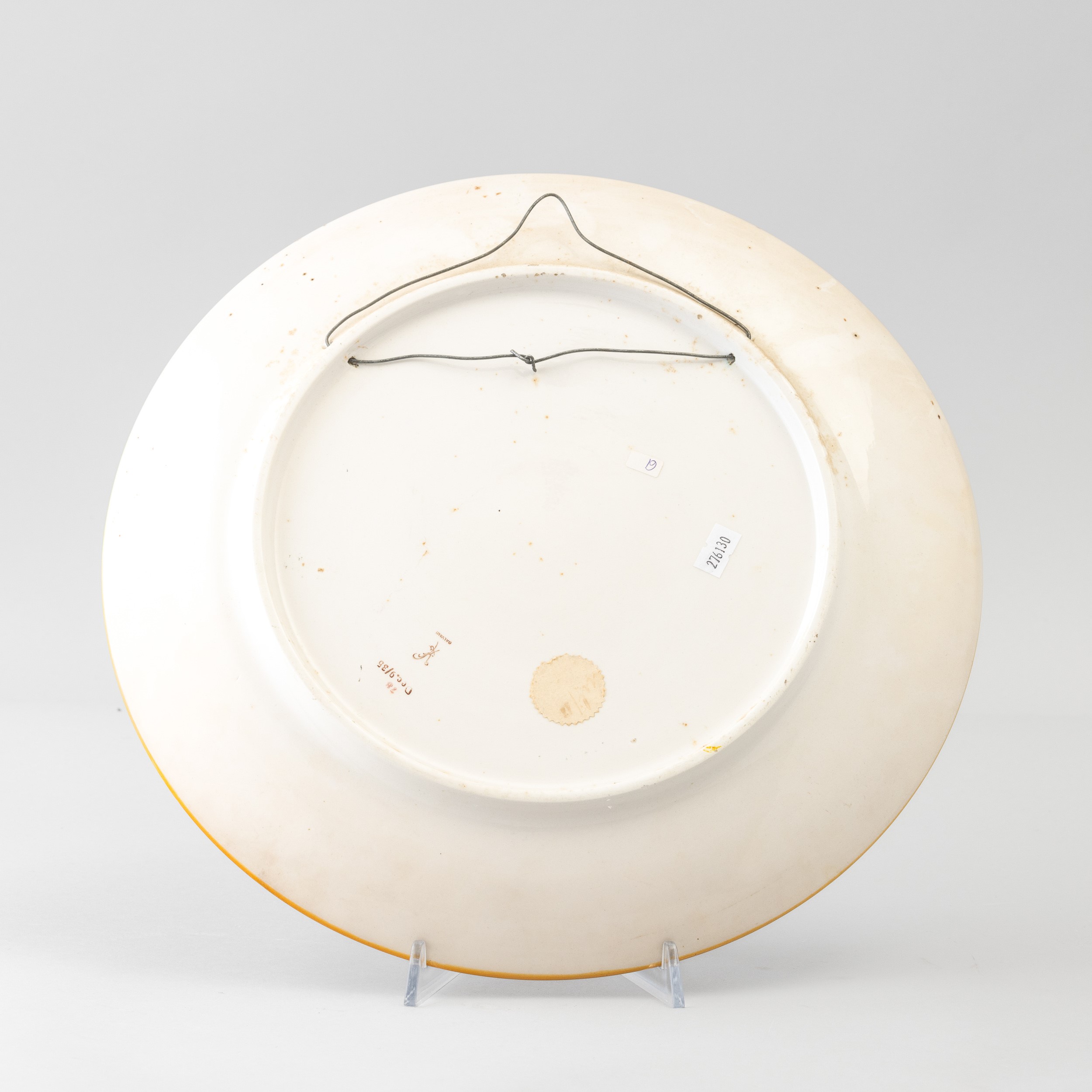 Piatto in terraglia con figura di donna con cesti fioriti decorata all’aerografo.