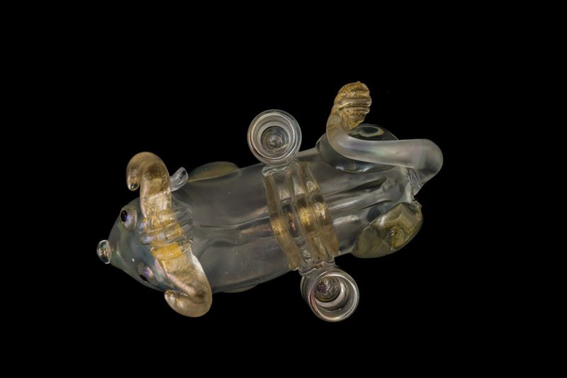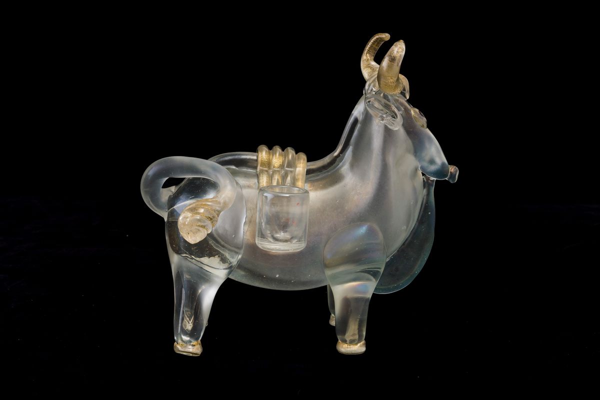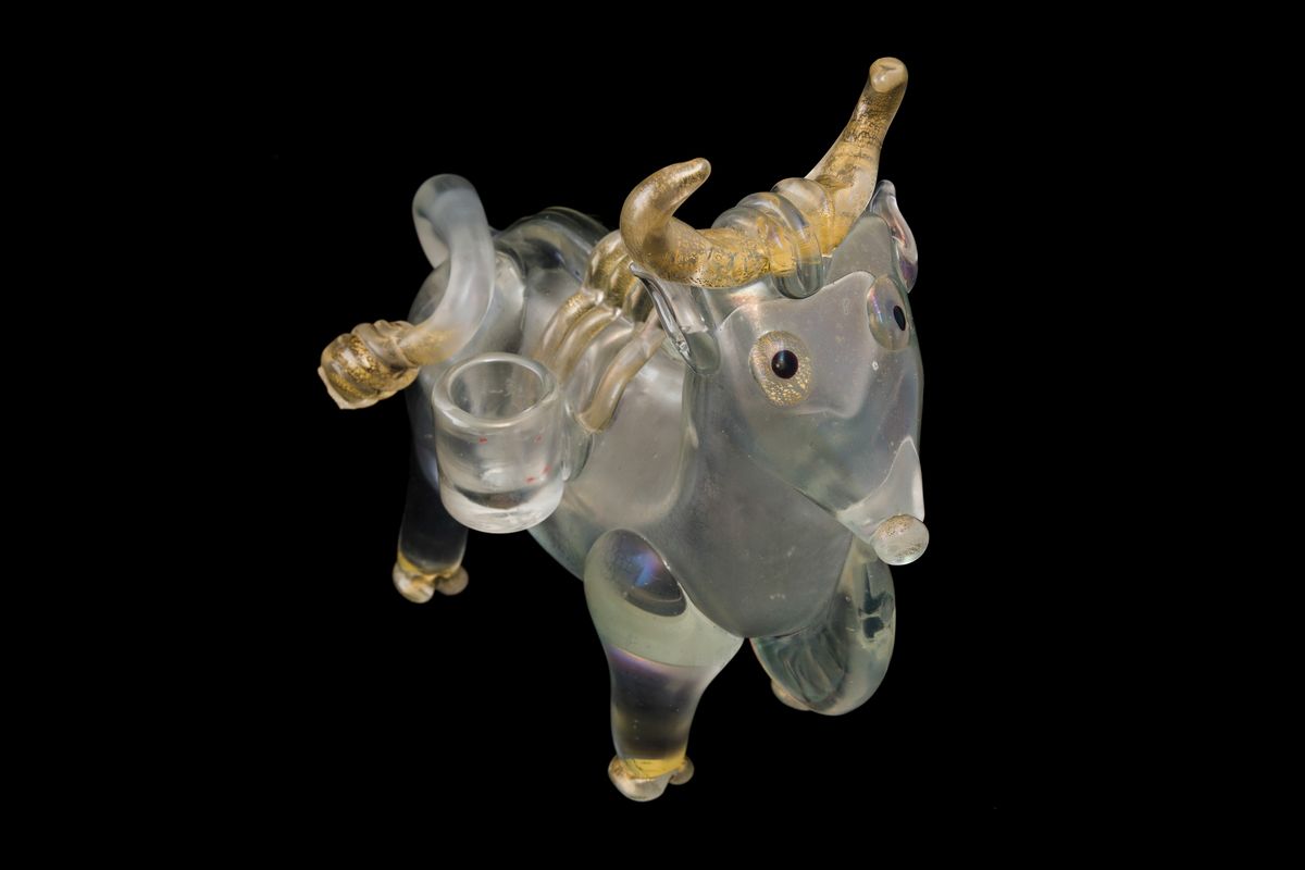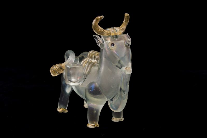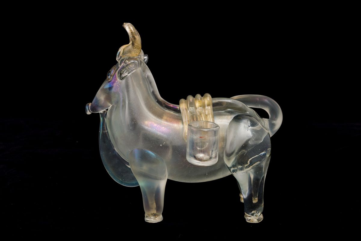 Porta candele in forma di toro in vetro massiccio iridato con decoro in foglia oro.