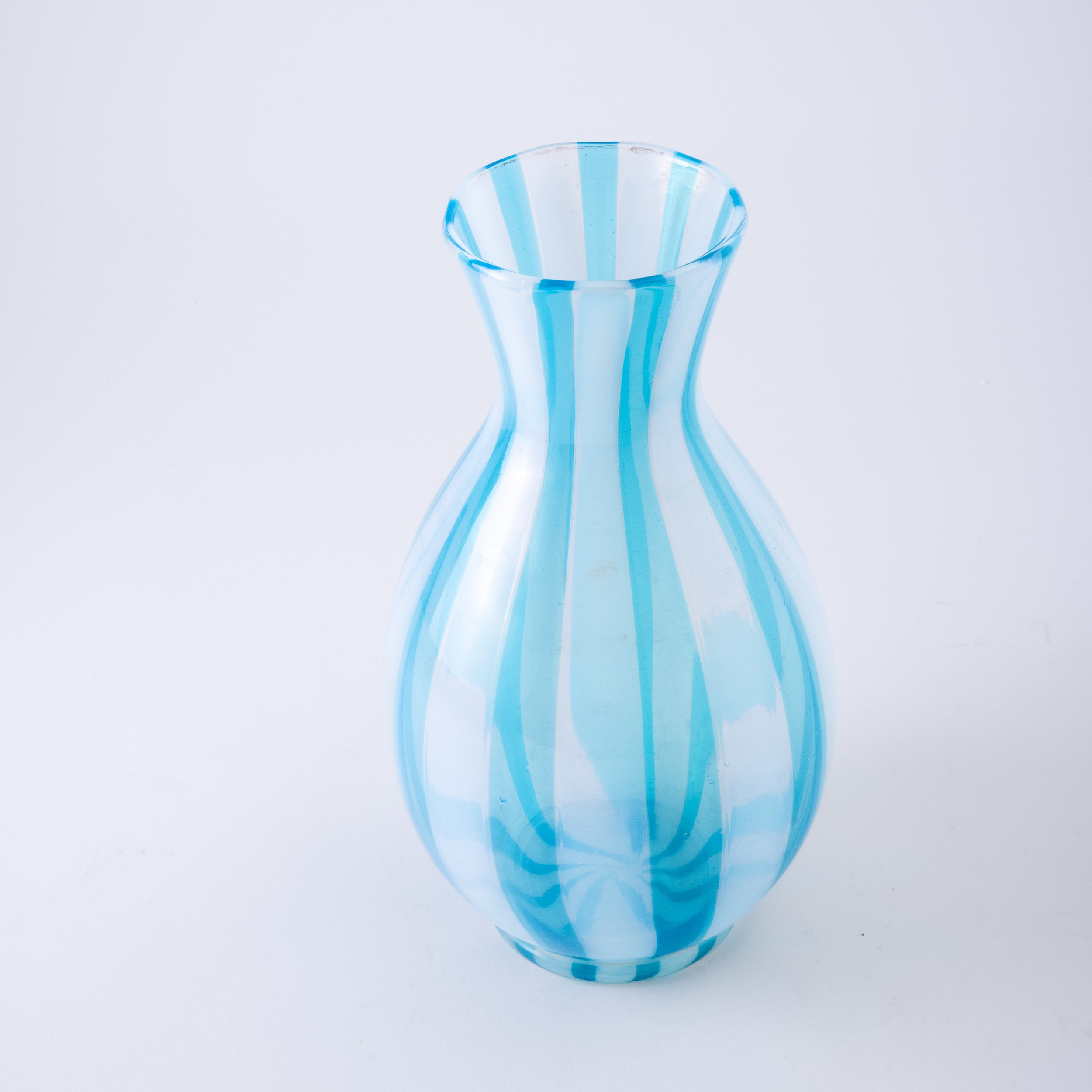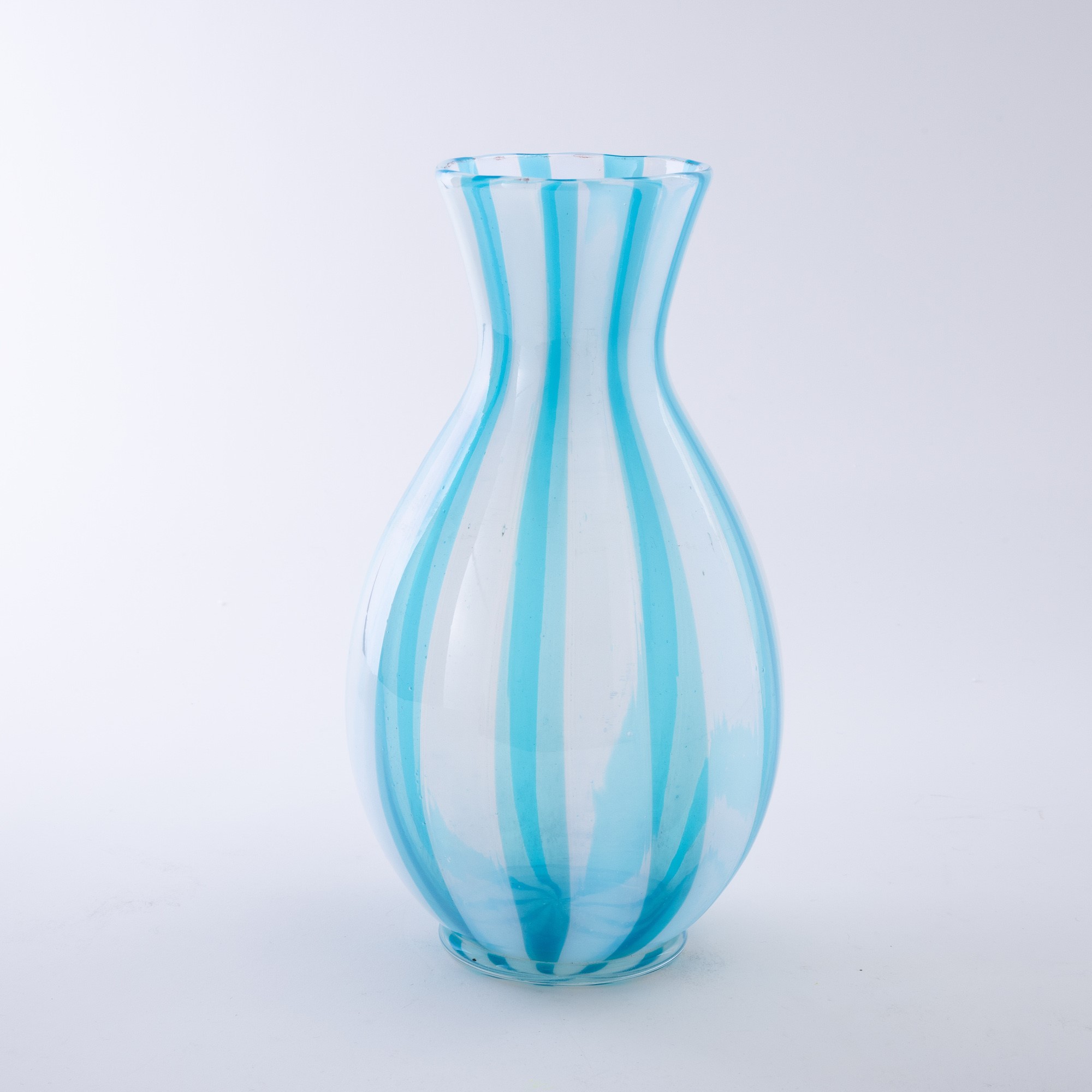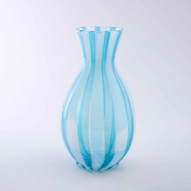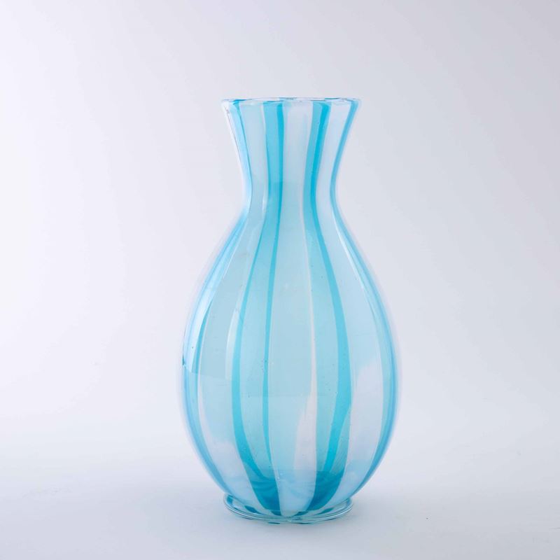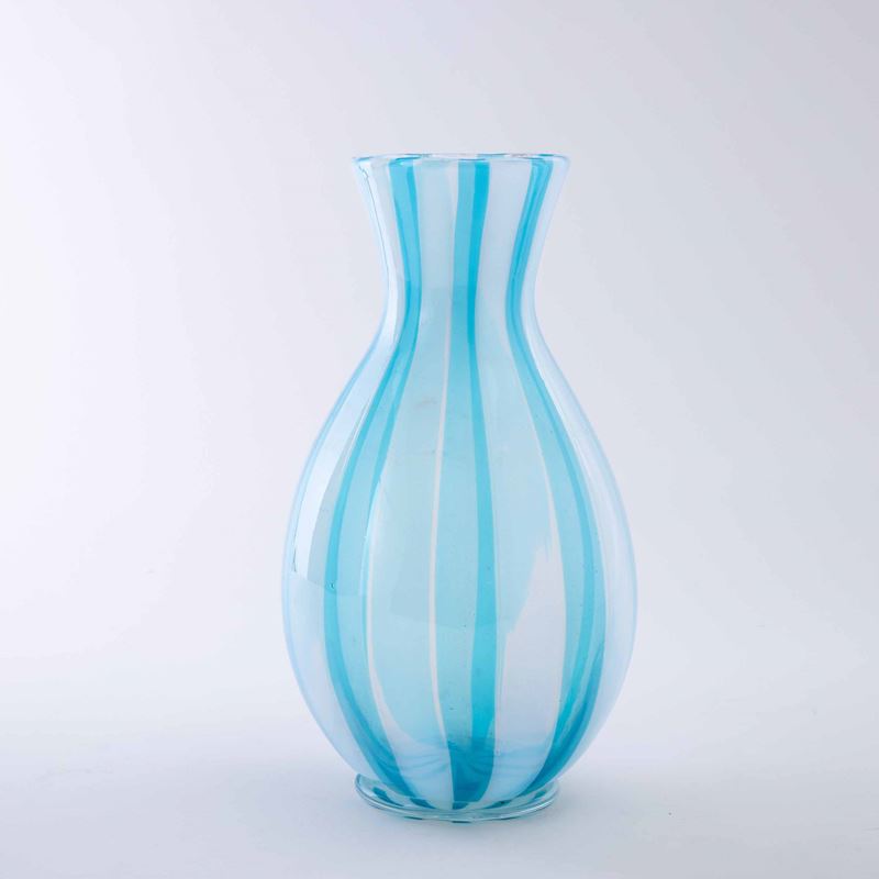 Vaso a balaustro con decoro di canne azzurre e opalescenti, piede applicato in vetro trasparente.