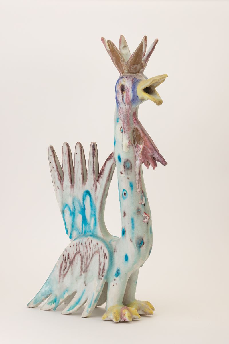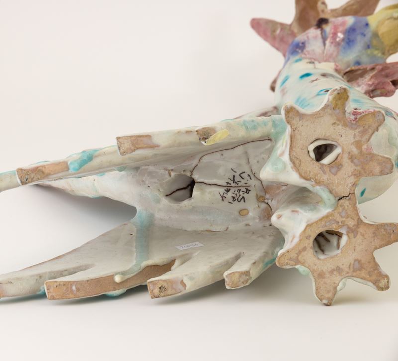 Grande scultura raffigurante gallo in terracotta con decoro di smalti policromi al sale.