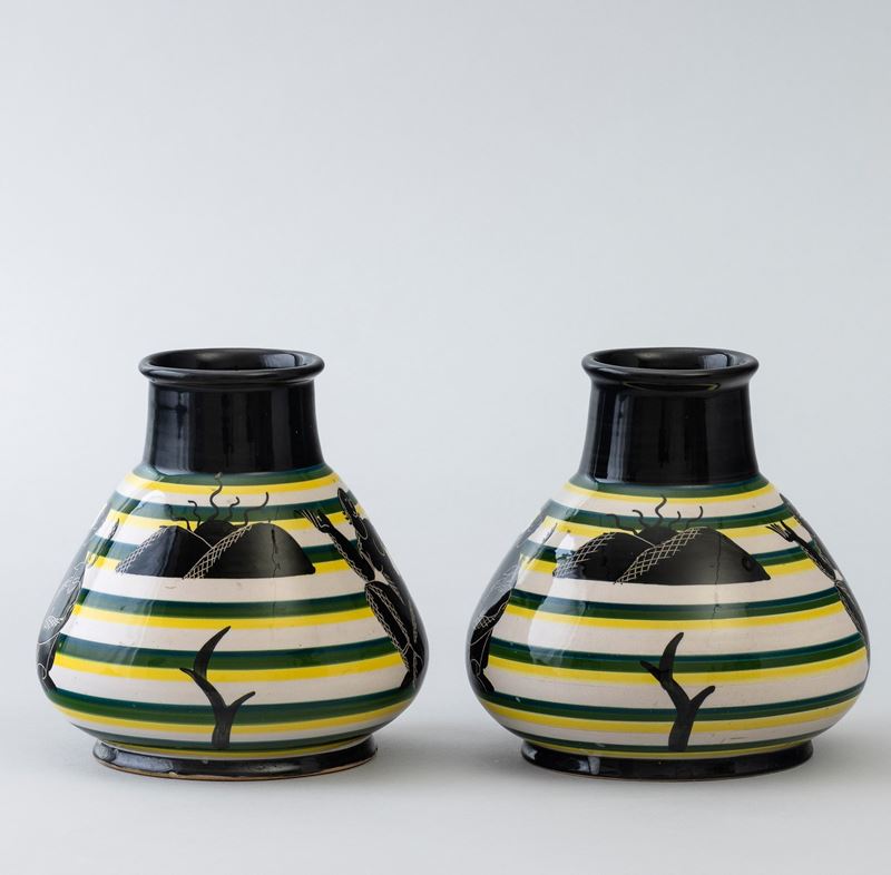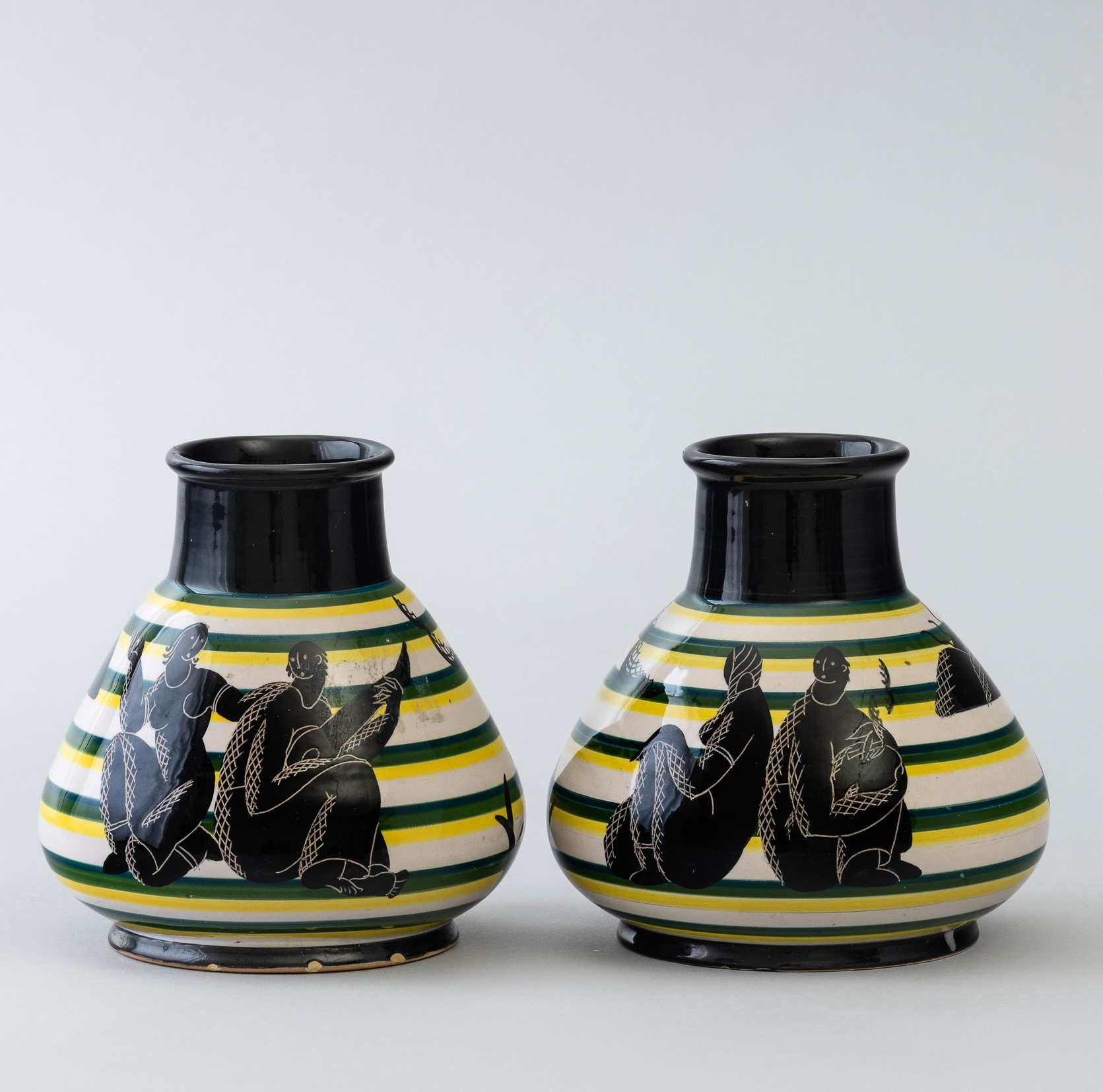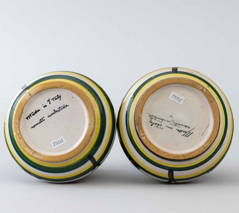 Coppia di vasi troncoconici in terraglia a colaggio con decoro di figure nere su fondo a fasce policrome.