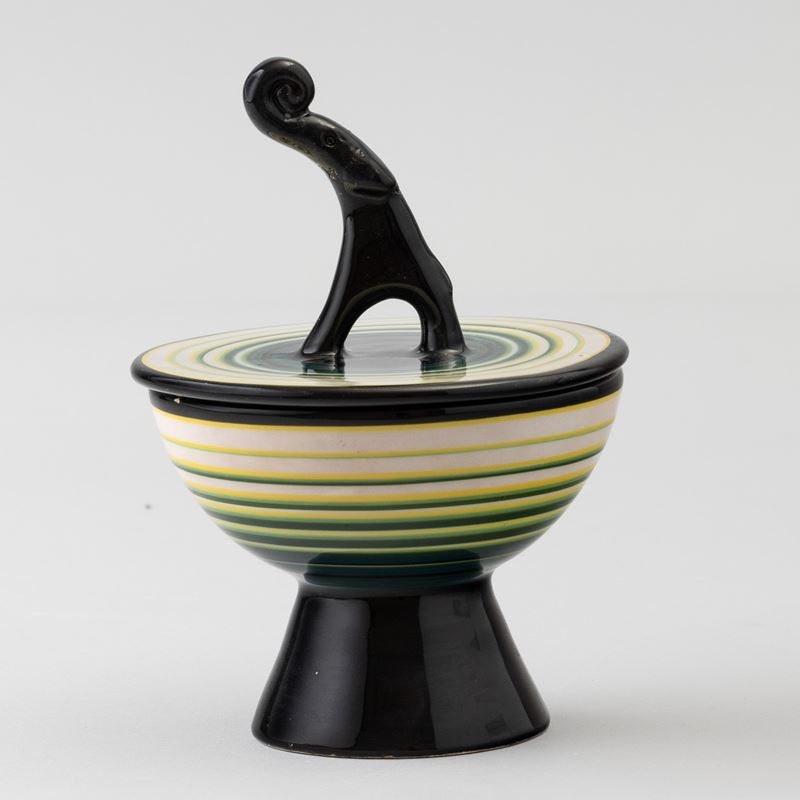 Portagioie con coperchio semisferico su alto piede troncoconico e presa in forma di elefante in terracotta maiolicata con decoro all'aerografo.