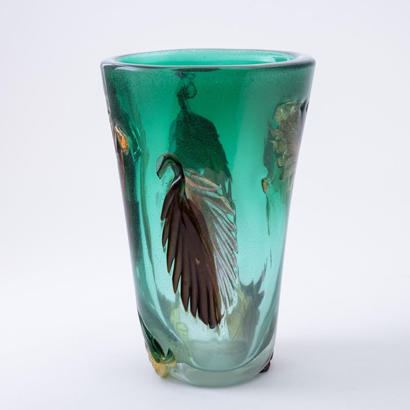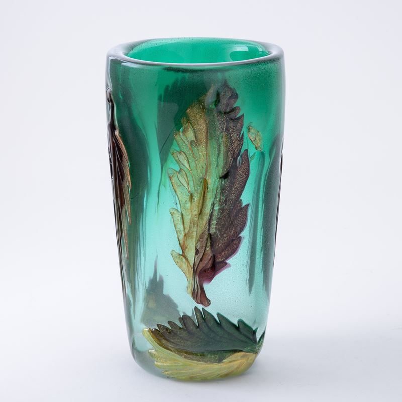 Raro vaso troncoconico a sezione ovale in vetro pesante con decoro di foglie applicate in vetro policromo e foglia oro.