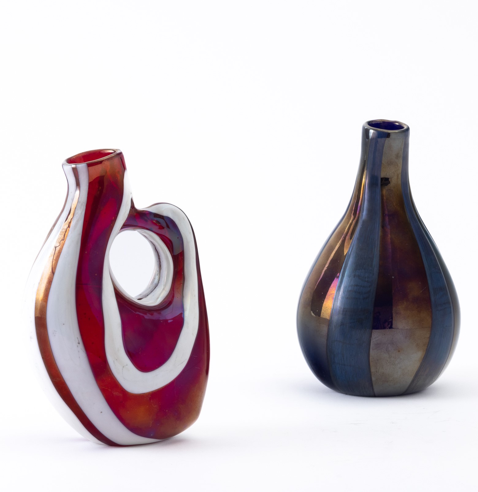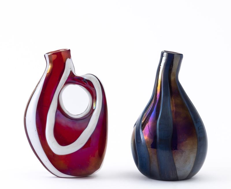 Lotto formato da due rari vasi in vetro soffiato con decoro di canne applicate. Superficie iridata.