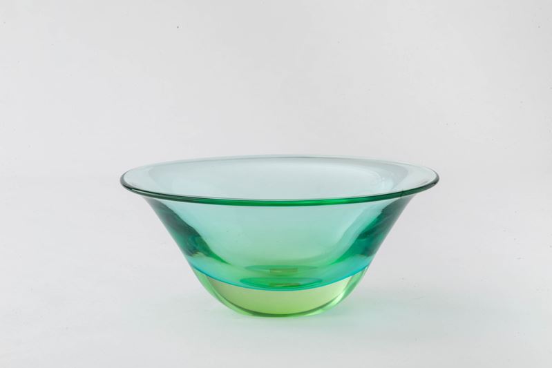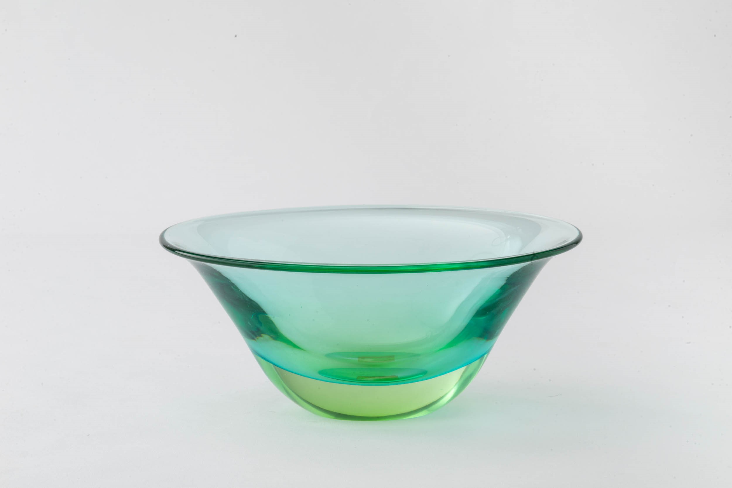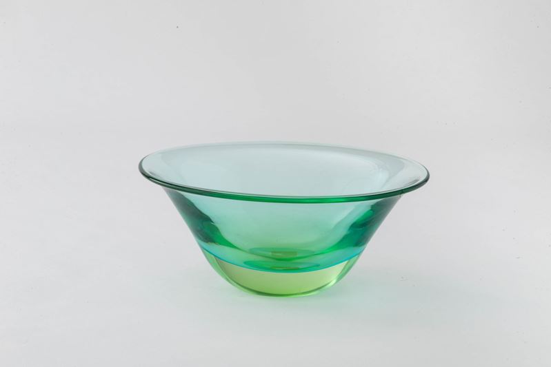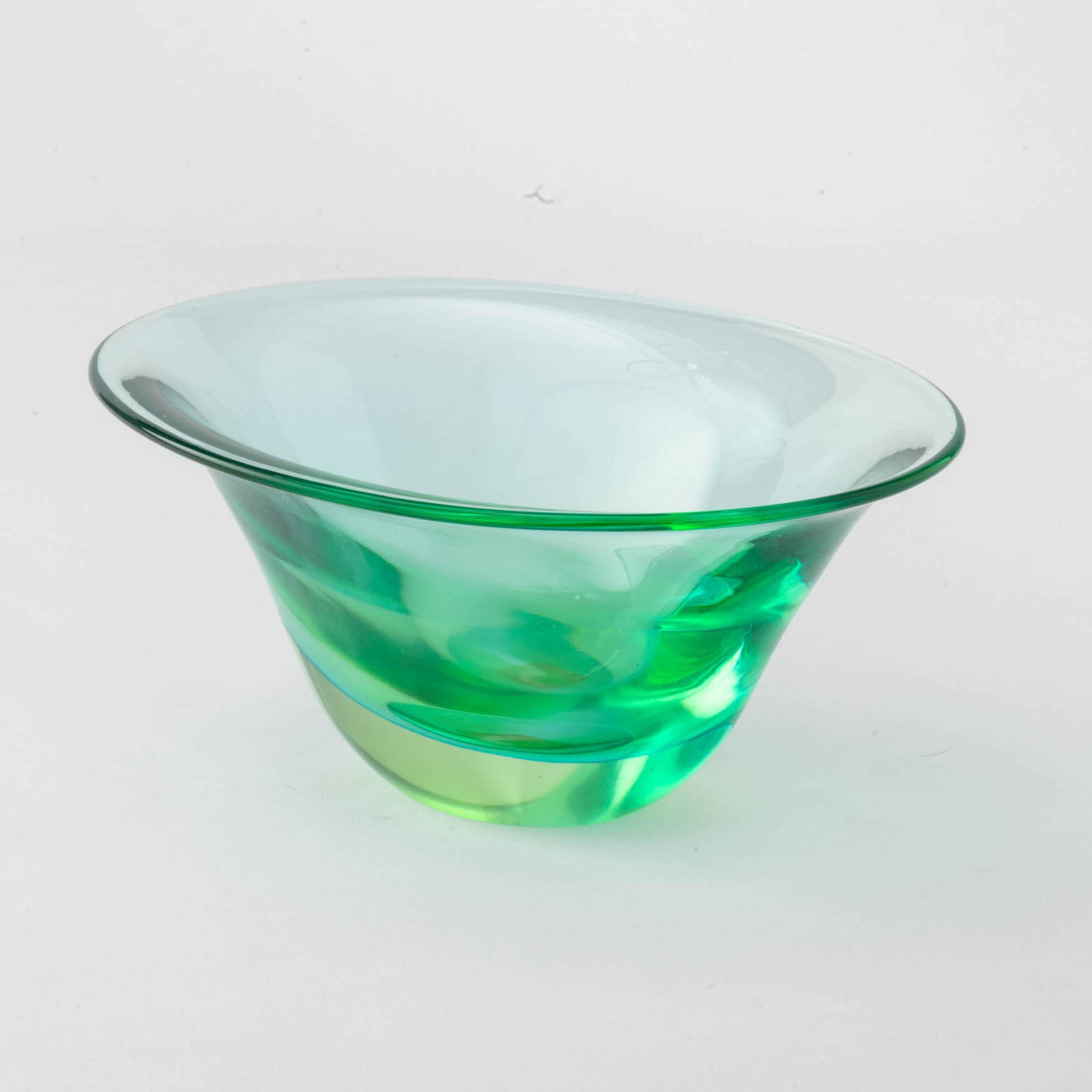 Coppa ovale in vetro sommerso nei colori verde erba e verde resina.