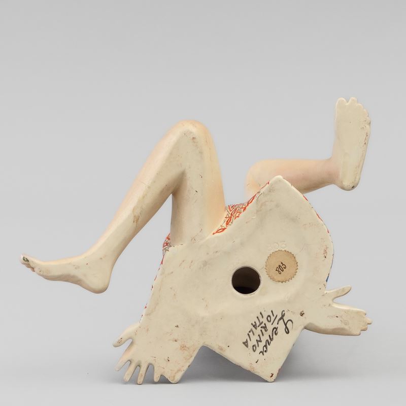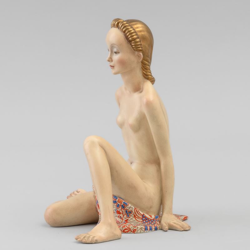Scultura di nudo con drappo in terraglia a colaggio con decoro policromo.