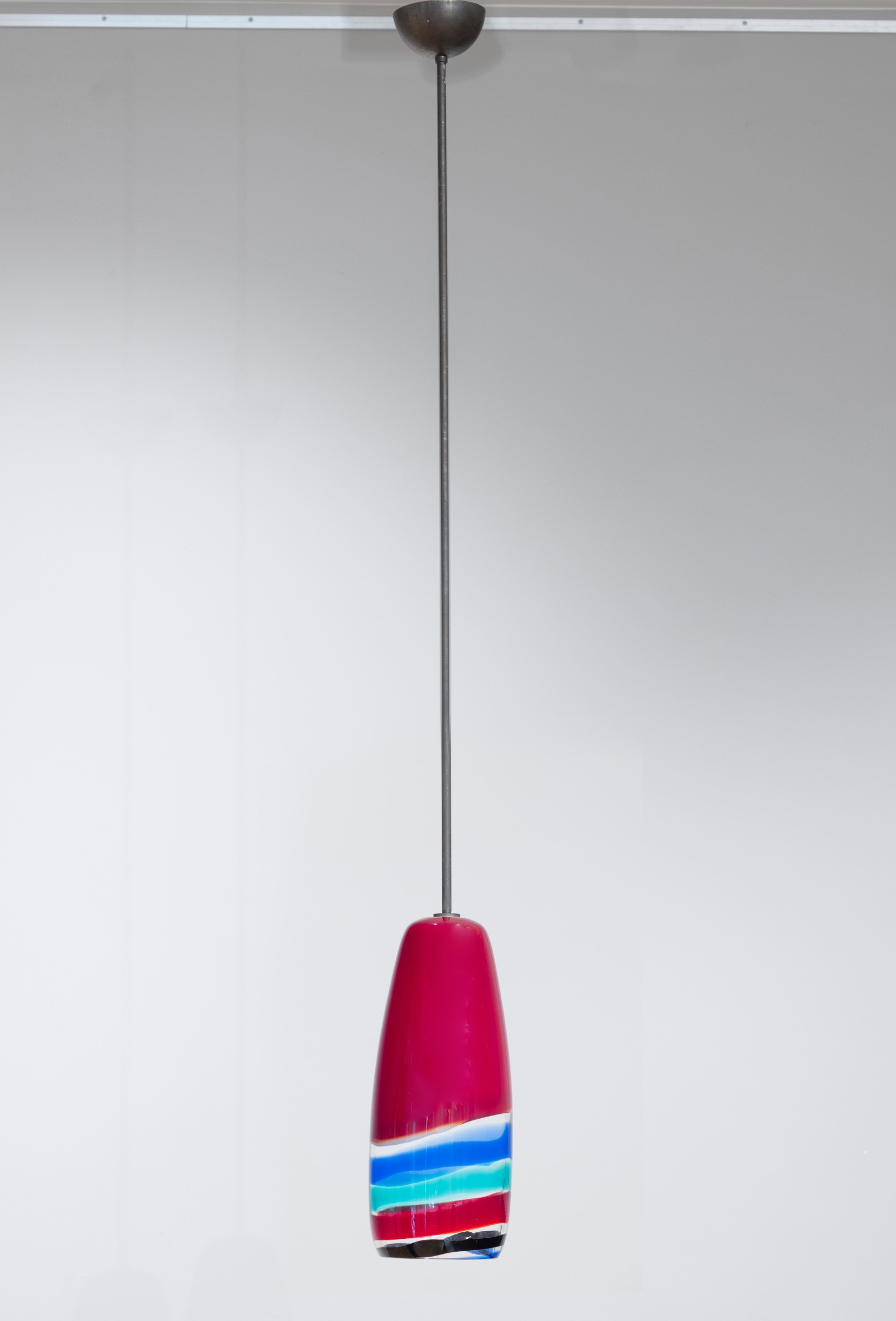 Lampada a sospensione troncoconica in vetro soffiato con decoro di fasce policrome.