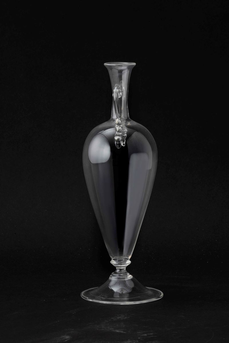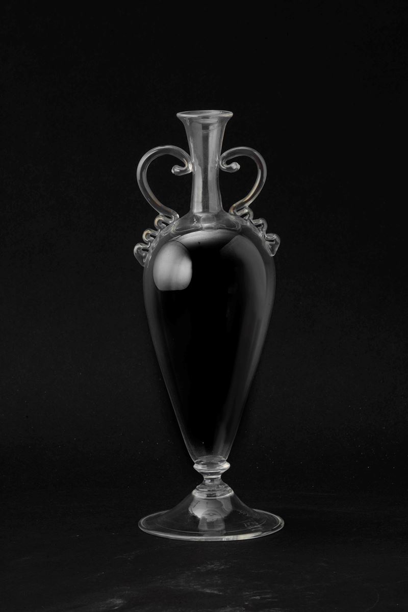 Vaso ad anfora su piede troncoconico in vetro trasparente con anse a serpentina applicate.
