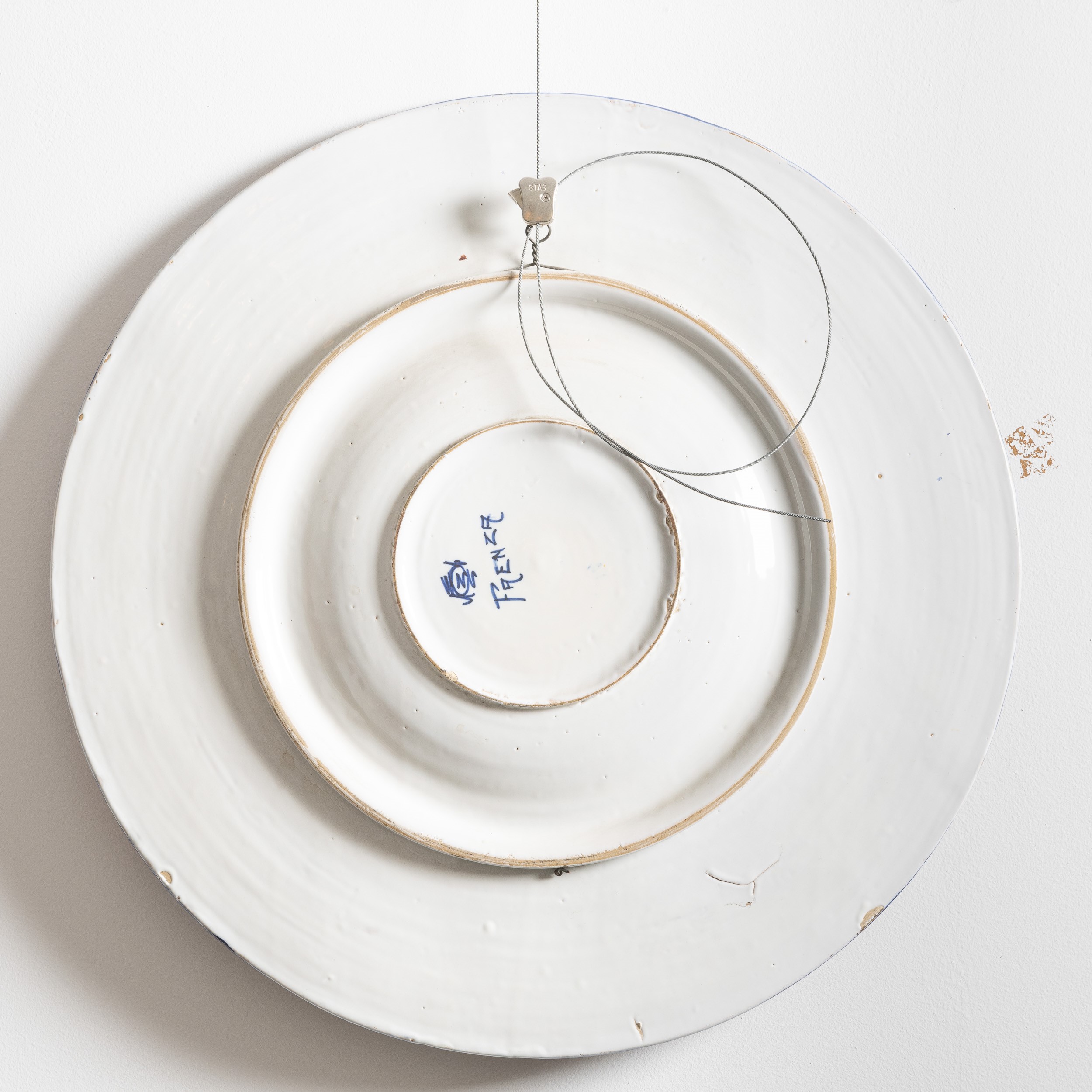 Grande piatto in terracotta maiolicata con decoro a smalti policromi di uccelli, rami, arabeschi e vasi stilizzati.