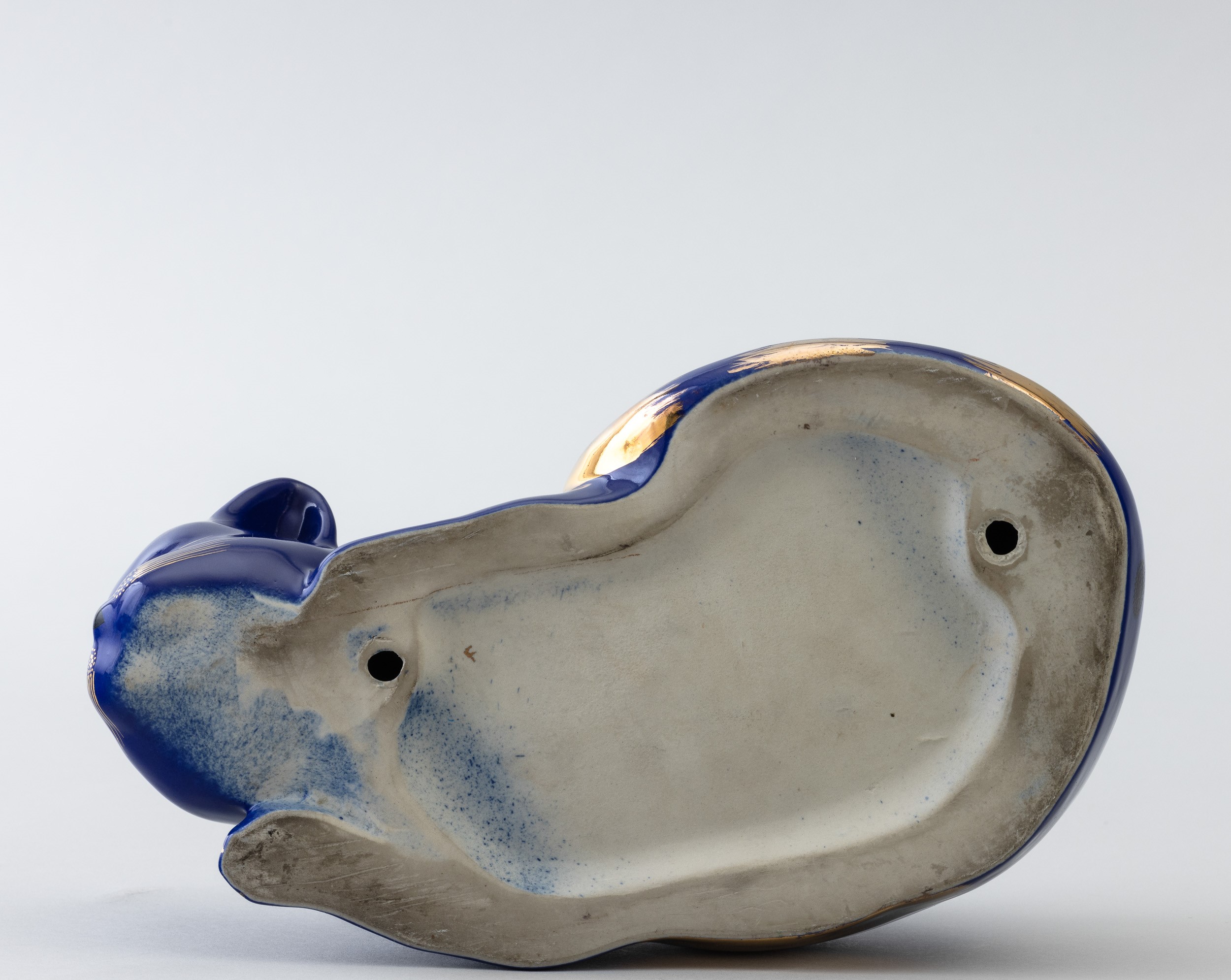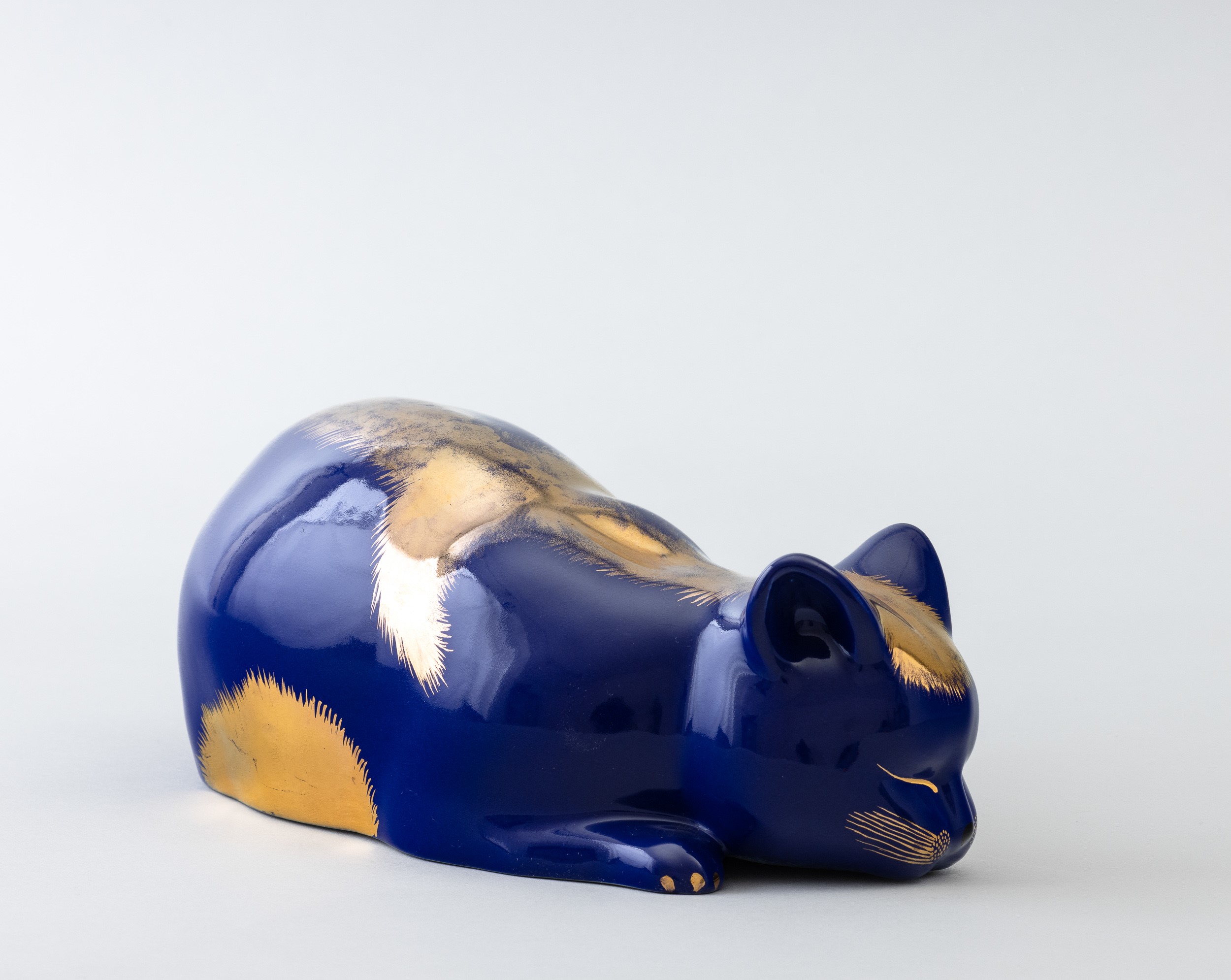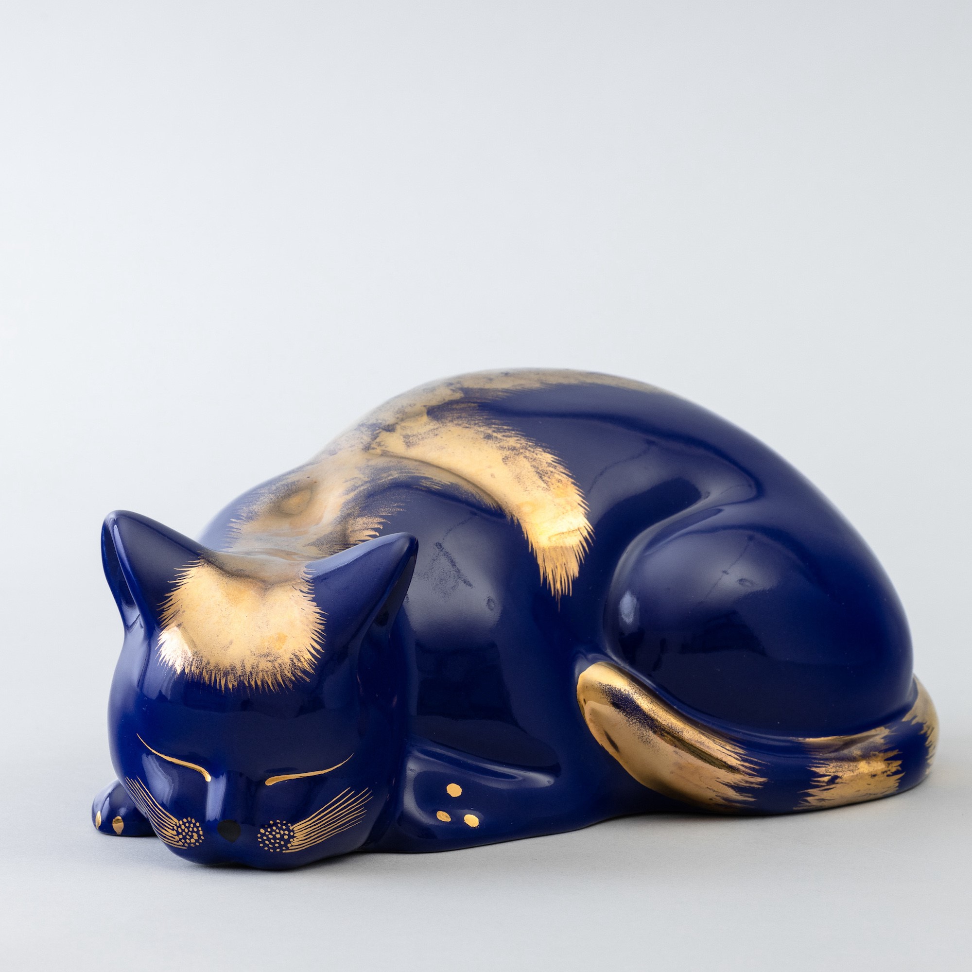 Scultura raffigurante gatto appisolato in ceramica a colaggio con decoro policromo e dorature.