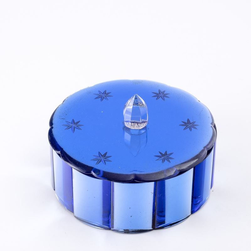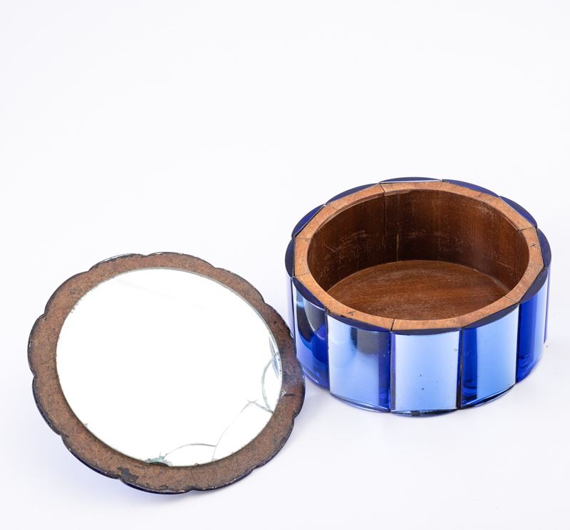 Scatola rotonda in legno di cedro rivestita con lastre di cristallo specchiato bluino. Coperchio con decoro di stelle incise e presa in forma di pigna.