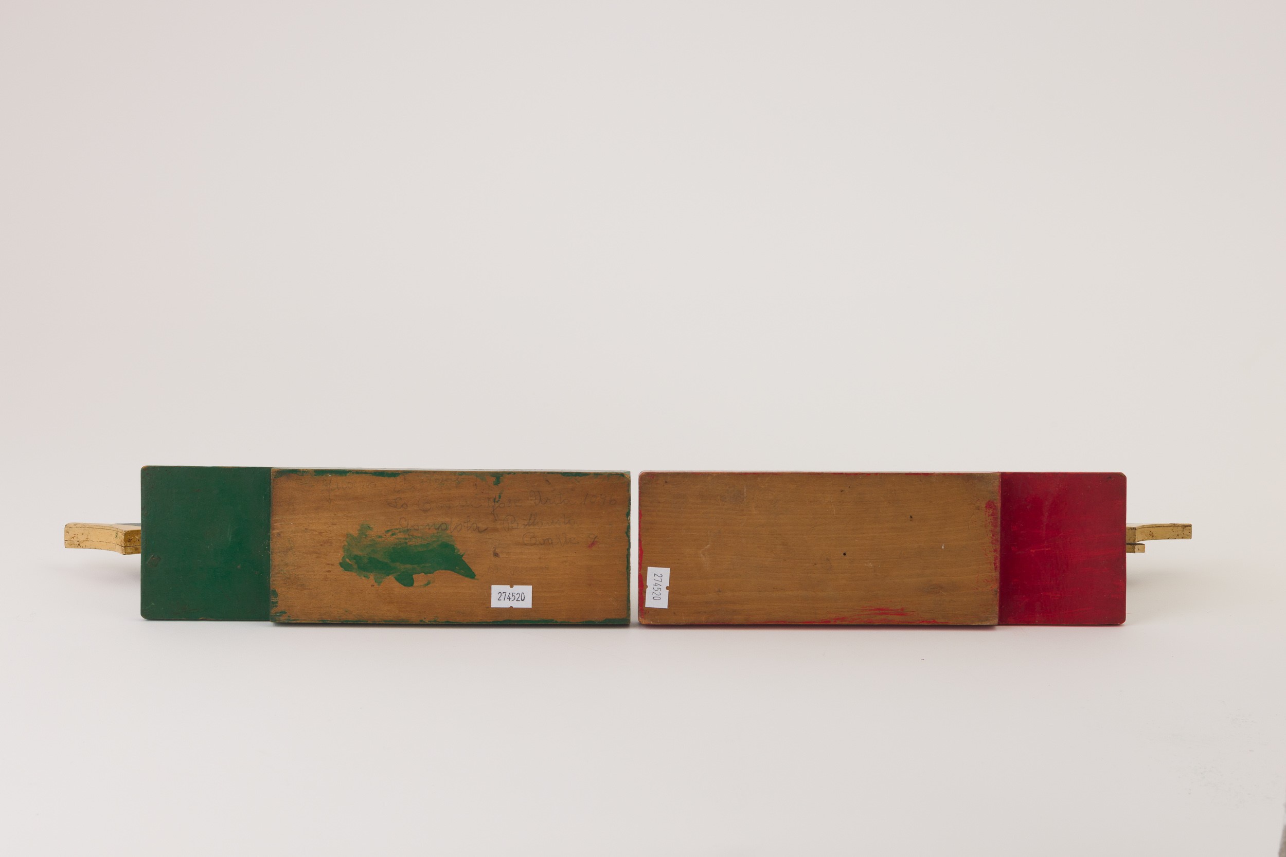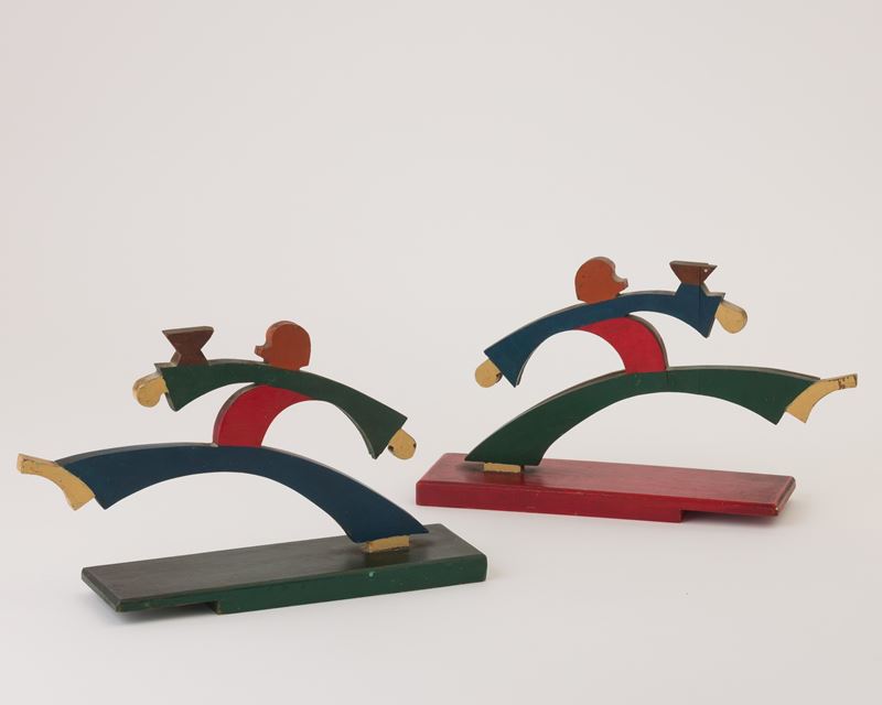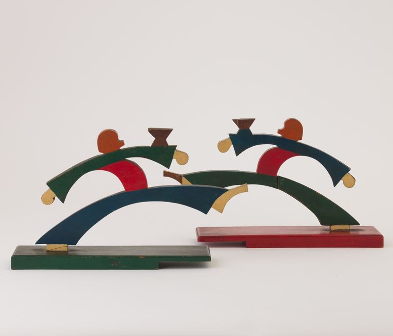 Coppia di sculture futuriste in legno dipinto in policromia.