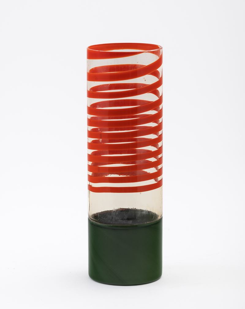 Vaso a cilindro in vetro soffiato con basamento ad incalmo antracite e decoro di spirale arancione.