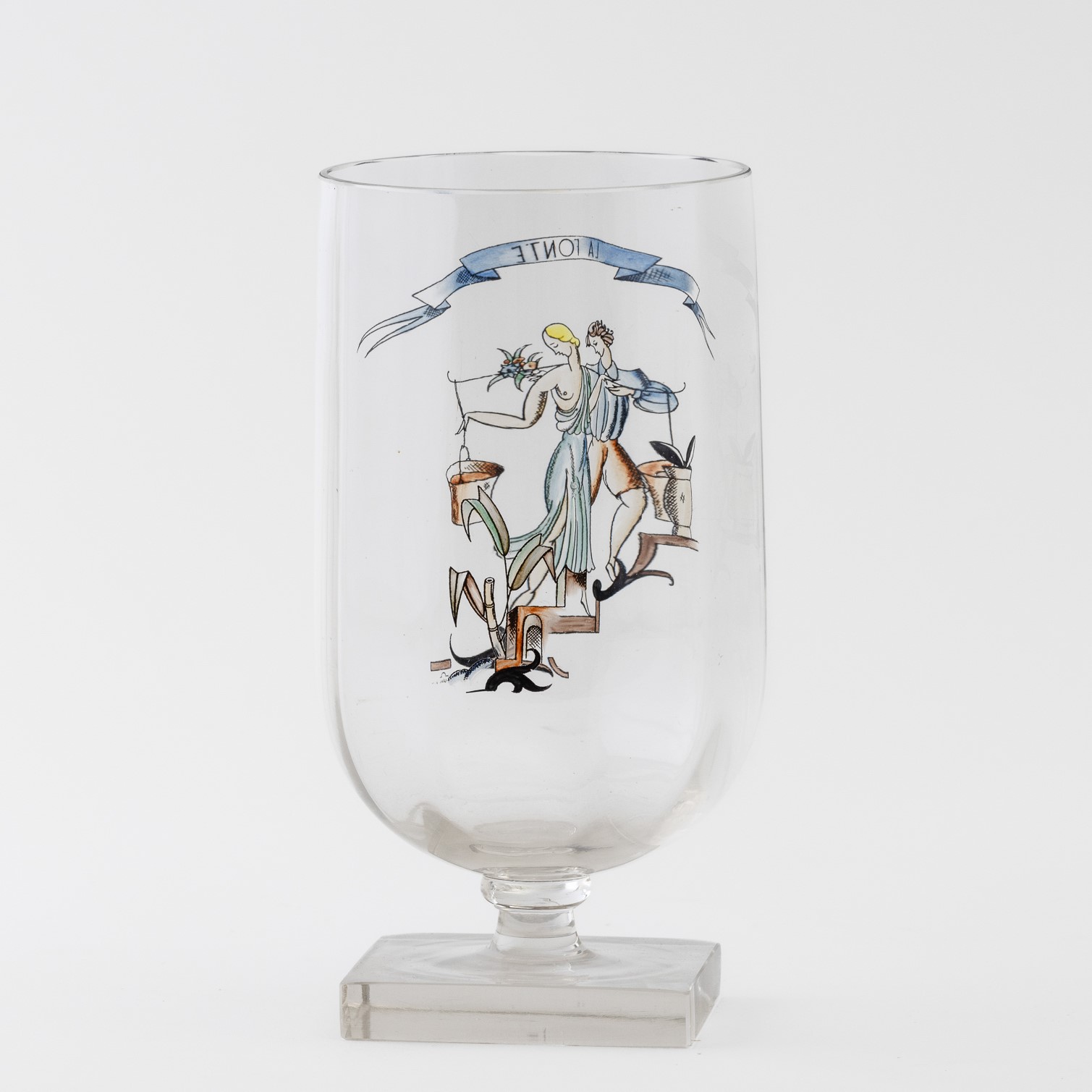 Vaso in cristallo con decoro a smalti policromi su base quadrata.