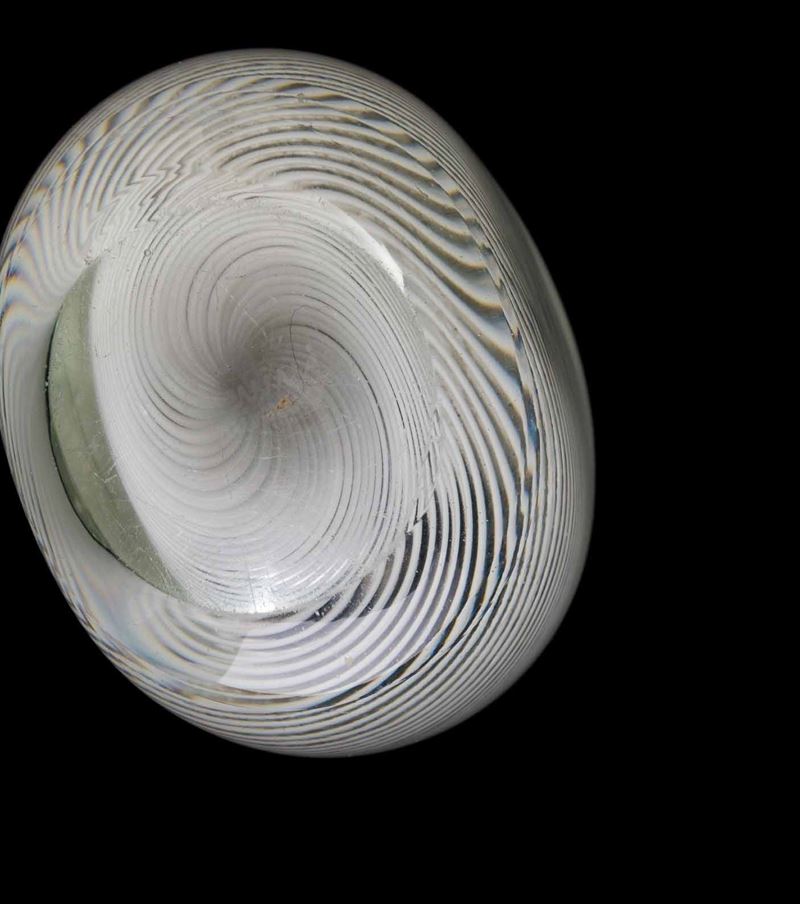 Piccolo vaso in vetro sommerso con decoro di filigrana lattimo.