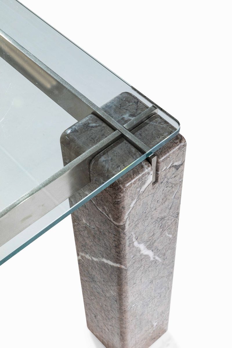 Struttura in acciaio, sostegni in marmo Mondragone e piano in cristallo molato.