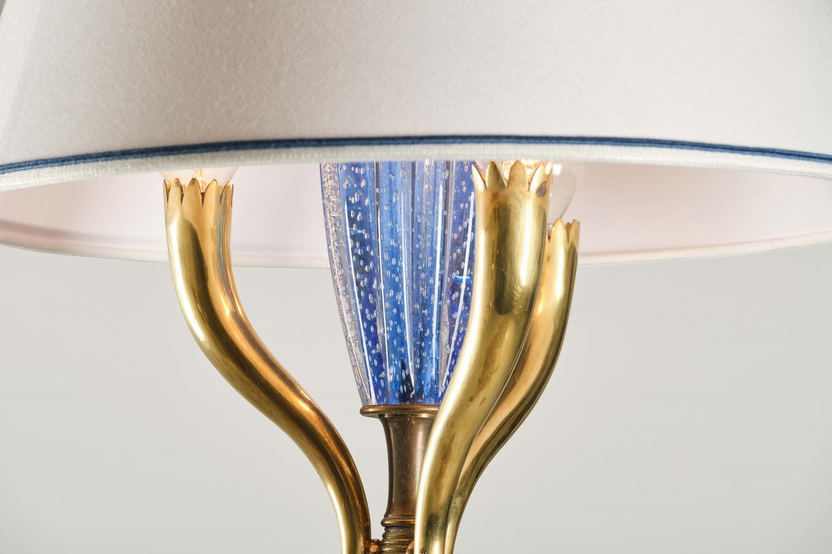 Struttura in metallo e ottone. Elementi in vetro di Murano. Paralume in tessuto.