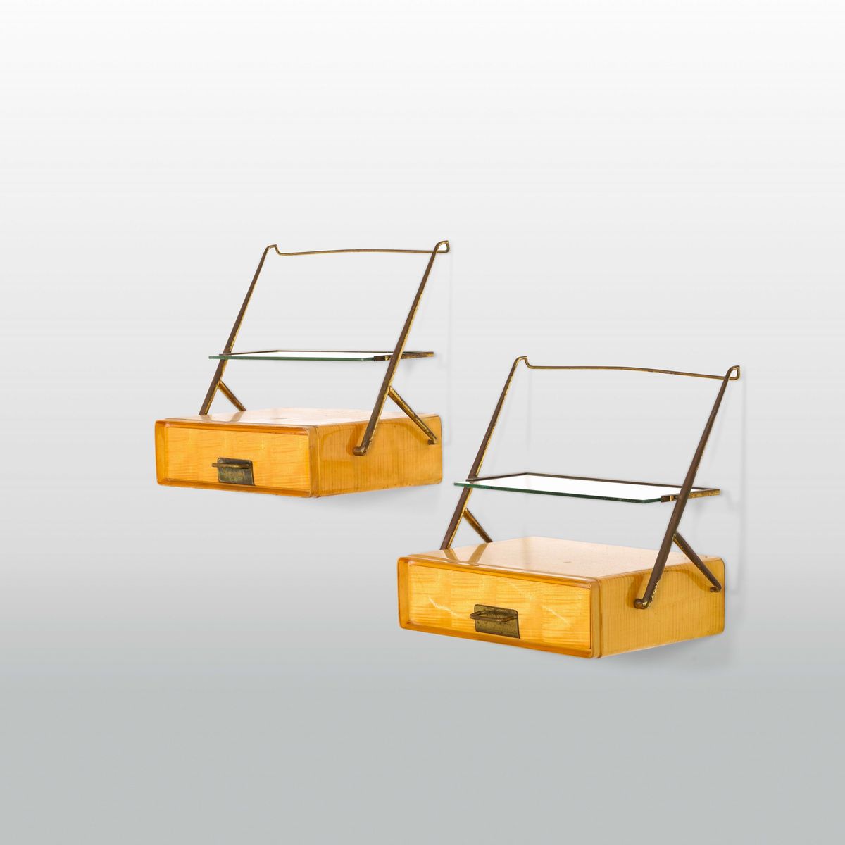 Struttura in legno con sostegni, attacchi a muro e dettagli in ottone. Piani in cristallo molato. Specchio in vetro.