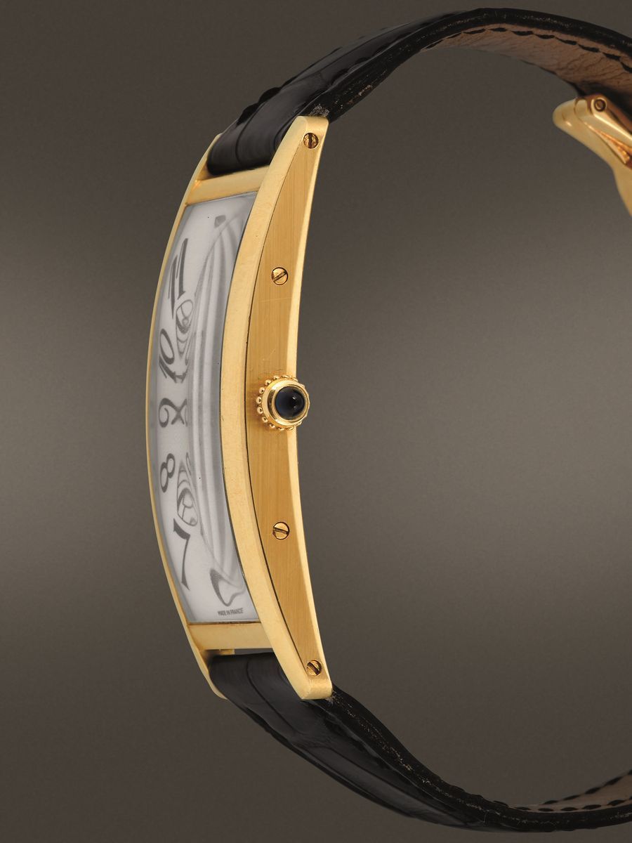 Forma rettangolare curva con quadrante a vetro zaffiro curvo. Quadrante con indici arabi stampati neri su fondo argento, lancette di tipo Breguet brunite. Presente una corona cabochon con zaffiro blu ad ogiva. Cassa in oro giallo 18 kt, come la sua deployante a lama singola. Cinturino in pelle nero.