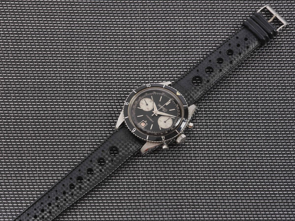 Quadrante nero con grafiche argentè. Indici a barretta e lancette ore e minuti dauphine rodiate con luminescenza. Lancette dei contatori a bastone brunite, datario alle ore 6 in rosso con cornice. Ghiera girevole con inserto in bachelite. Cassa in acciaio con fondello a vite, corona impermeabile e tasti a pompa. Vetro in esalite. Cinturino nero in gomma con fibbia marchiata.
