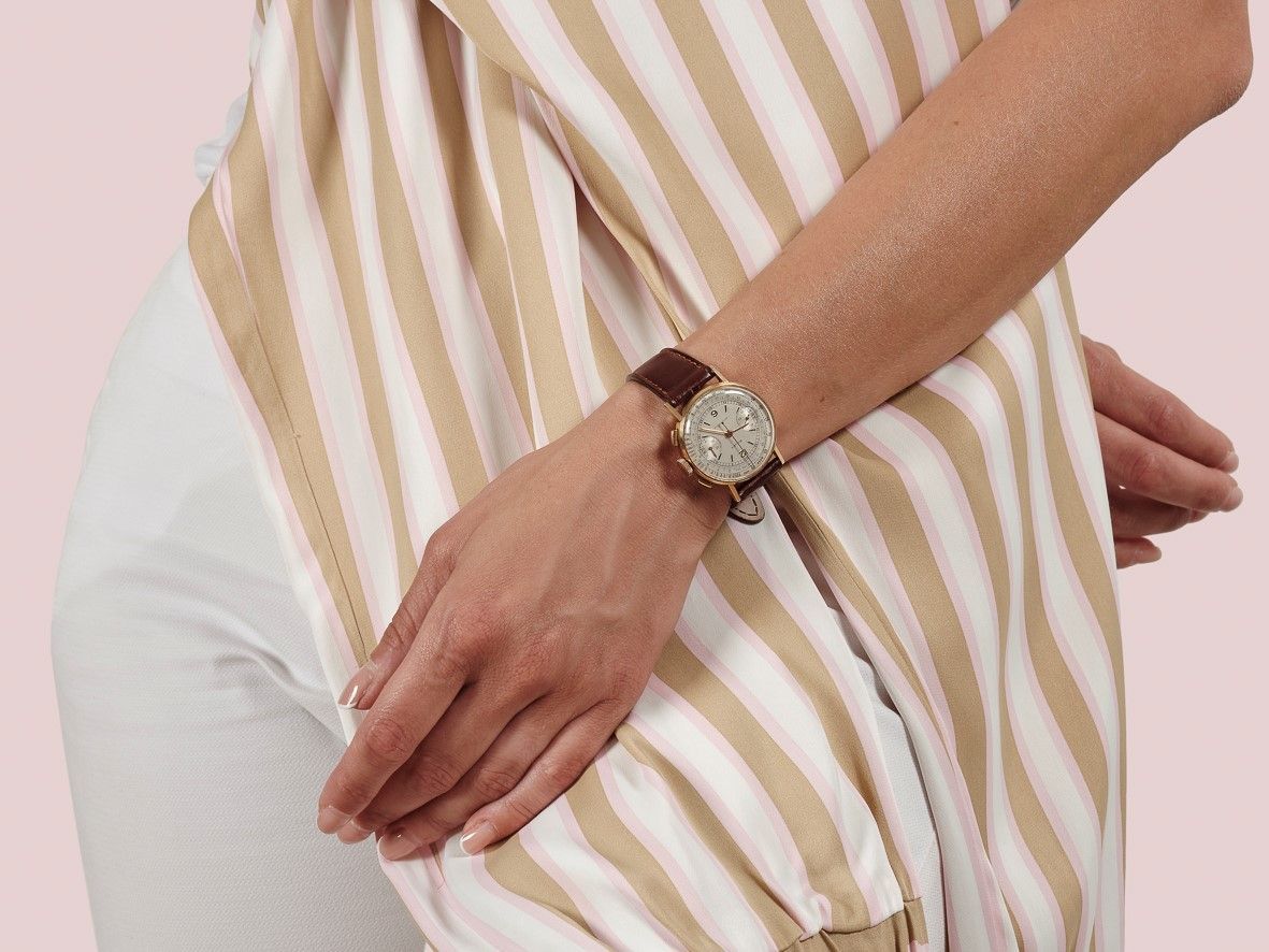 Quadrante argentè e gioco sfere a bastone. Doppia scala periferica: tachimetrica in base 1000 nera e telemetrica in base 1km blu. Cassa in oro rosa 18 kt con fondello e lunetta a pressione e vetro in esalite, anse squadrate e tasti rettangolari. Cinturino in pelle marrone con fibbia dorata.