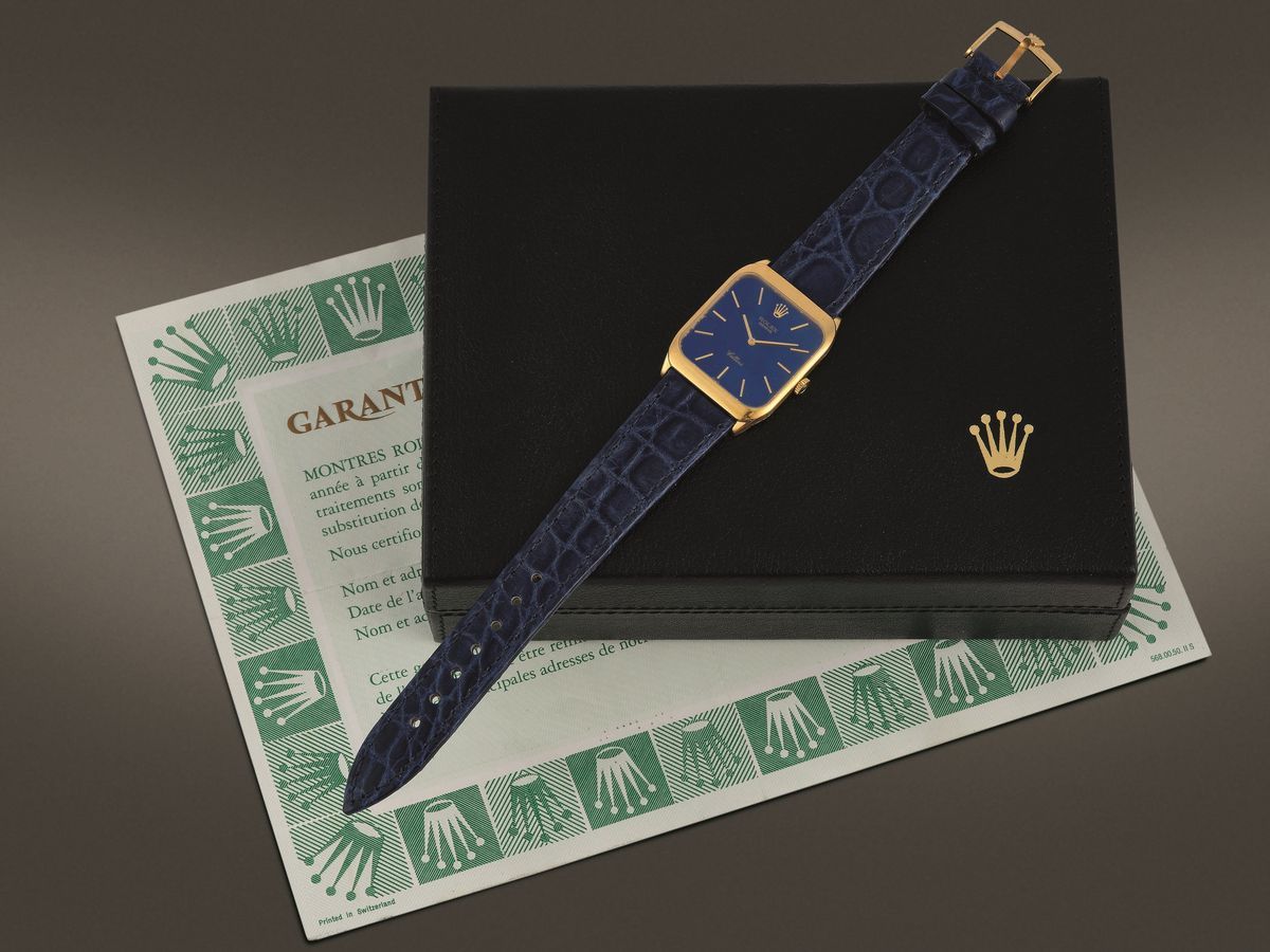 Quadrante blu, indici applicati e lancette a bastone in oro, cassa in oro giallo 18 Kt di forma rettangolare, con fondello a pressione, corona marchiata Rolex e vetro zaffiro piano.