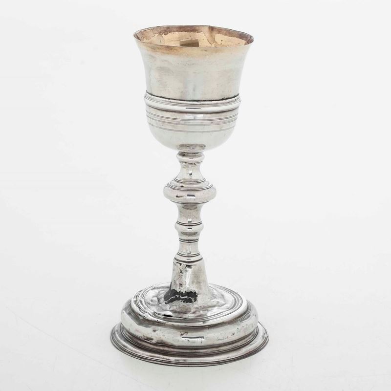 Calice. Argento fuso, tornito, sbalzato e dorato. Genova XVIII secolo. Marchio della “Torretta”