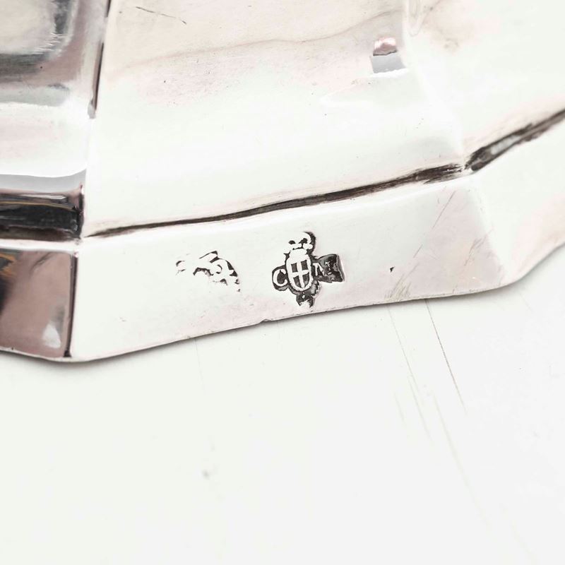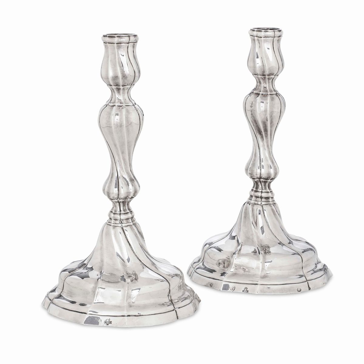 Coppia di candelieri. Argento fuso e sbalzato. Torino seconda metà del XVIII secolo, saggiatore Carlo Micha (1759-1787), [..]