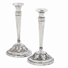 Coppia di candelieri. Argento fuso, sbalzato e cesellato. Siena XIX secolo. Marchio dell’argentiere GB in campo ovale della bottega Bonechi