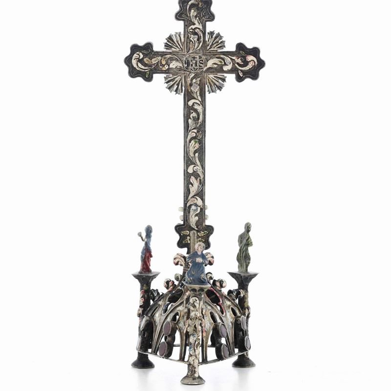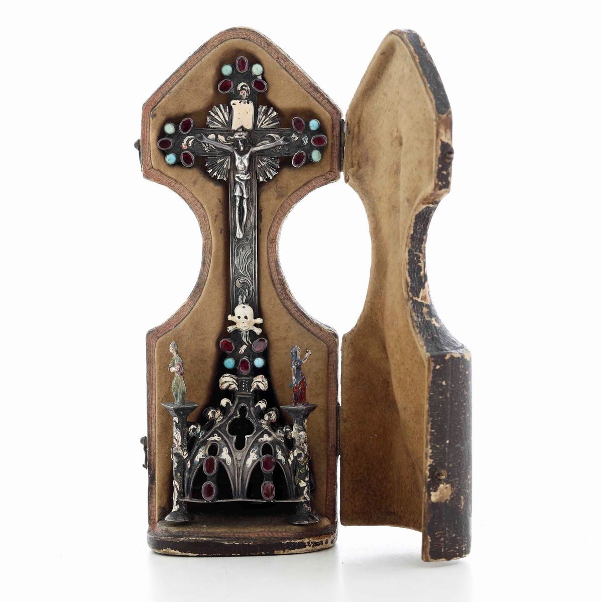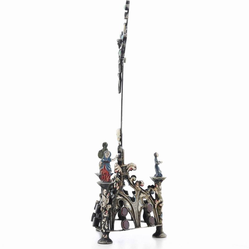 Crocifisso da meditazione. Argento fuso, traforato, cesellato e smaltato. Castoni con pietre colorate e turchesi. Probabilmente Vienna XIX secolo