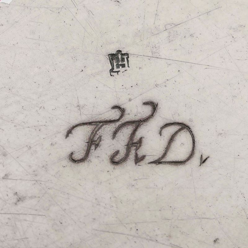 Piatto. Argento fuso e sbalzato. Genova XVIII secolo. Marchio della “Torretta” con datario consunto