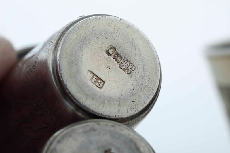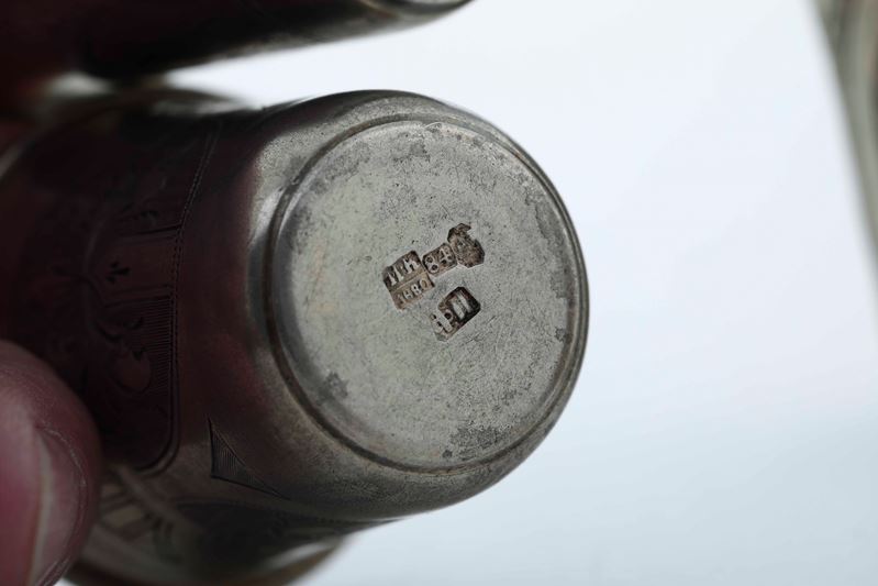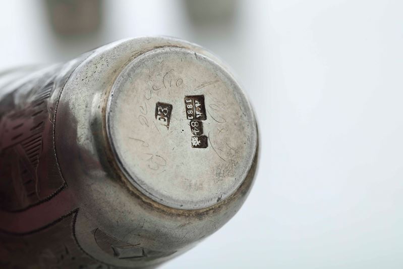 Quattro bicchieri. Argento fuso, sbalzato e cesellato. Russia fine XIX secolo, differenti manifatture