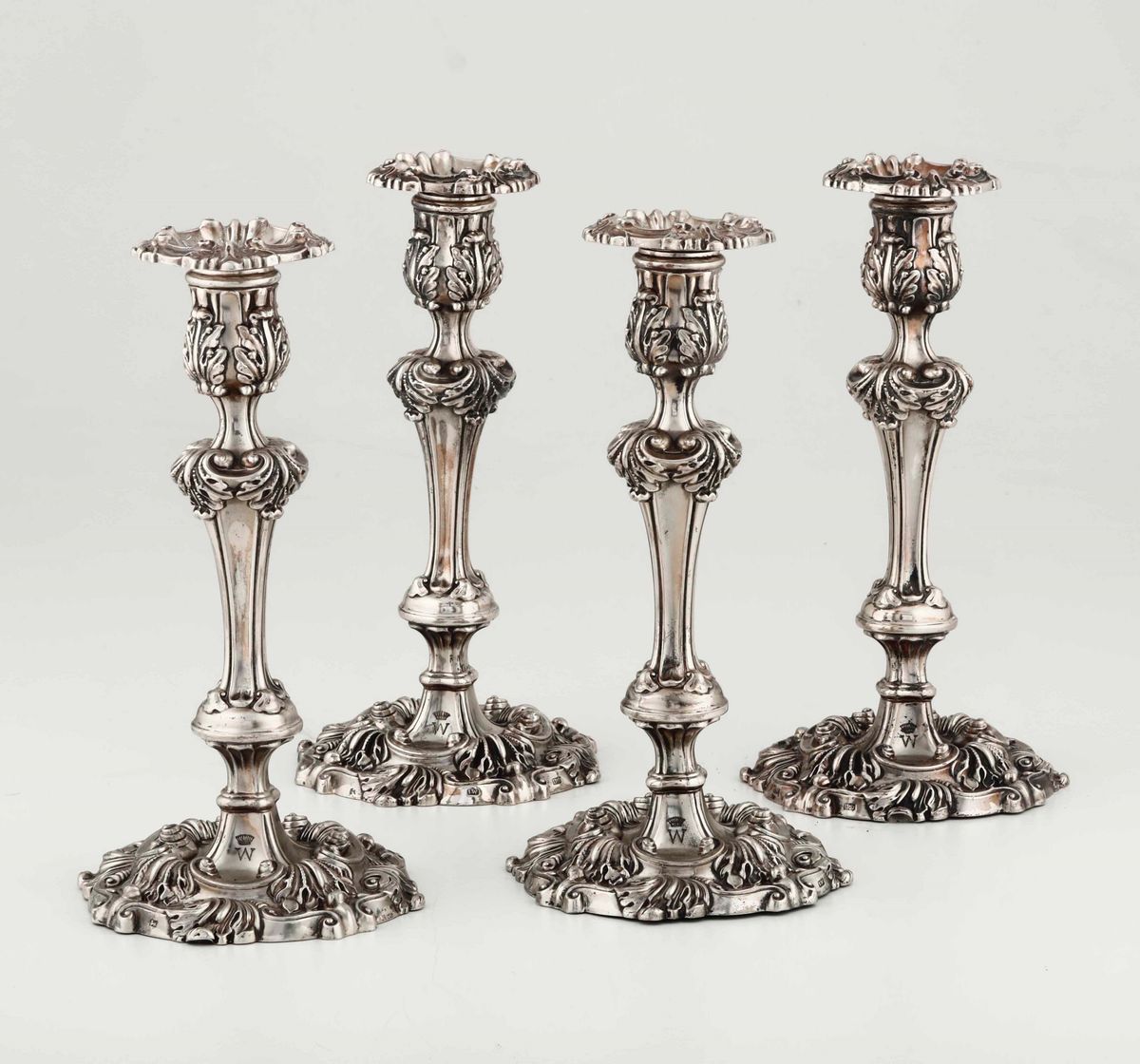 Raro insieme composto da 2 candelabri e 4 candelieri in argento Sterling fuso e cesellato. Inghilterra secondo quarto del XIX secolo. Marchi della città di Sheffield e dell'argentiere John Watson (un candeliere con marchio per l'anno 1838 e rimanenti 3 candelieri e 2 candelabri con marchio per l'anno 1840)