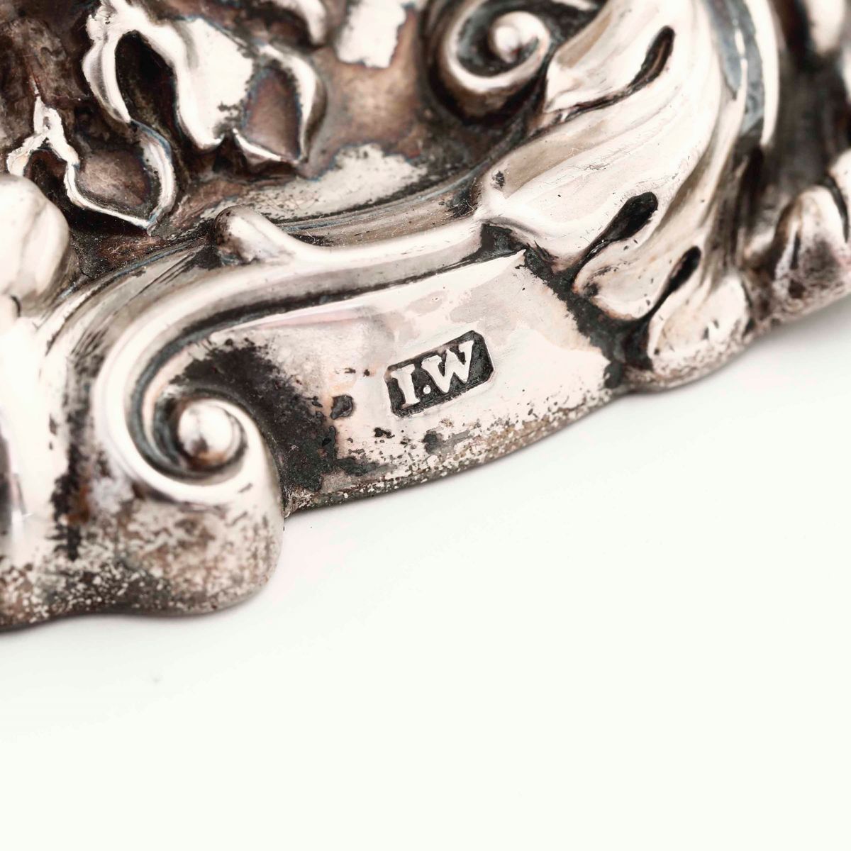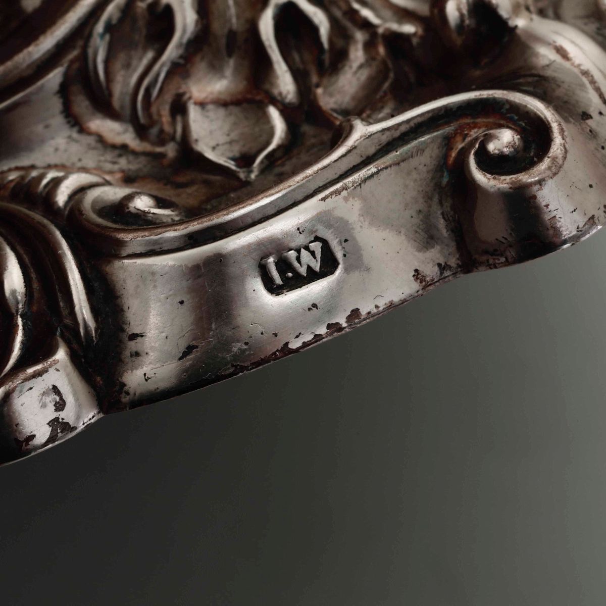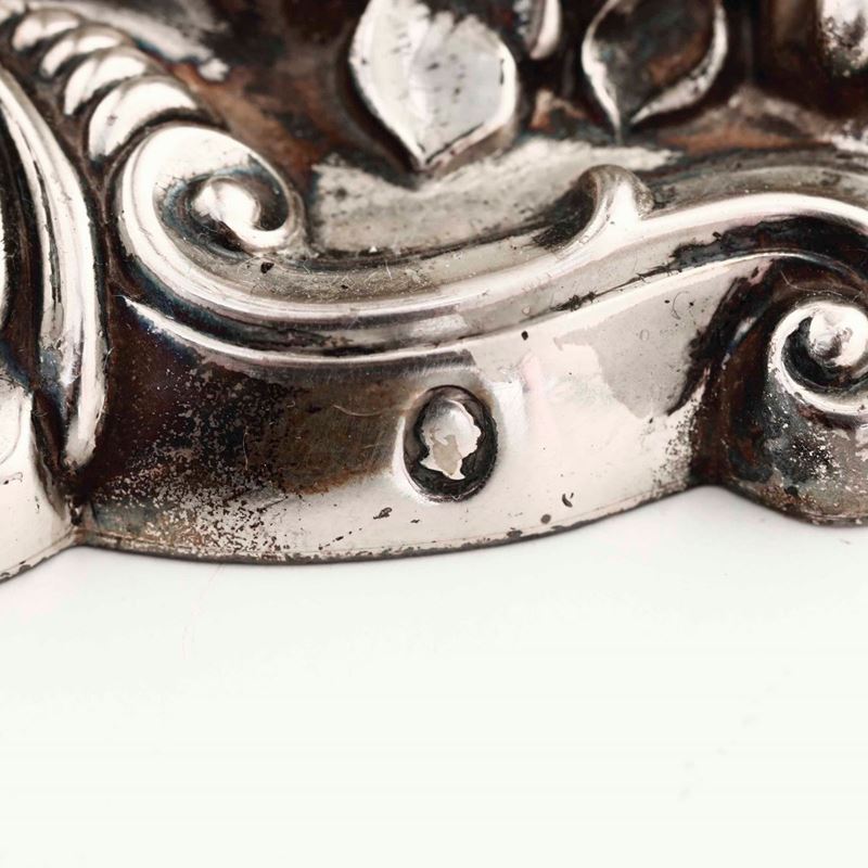 Ricchi decori a volute e fogliacei, basi sagomate con inciso a cesello monogramma raffigurante lettera "W" sormontata da corona