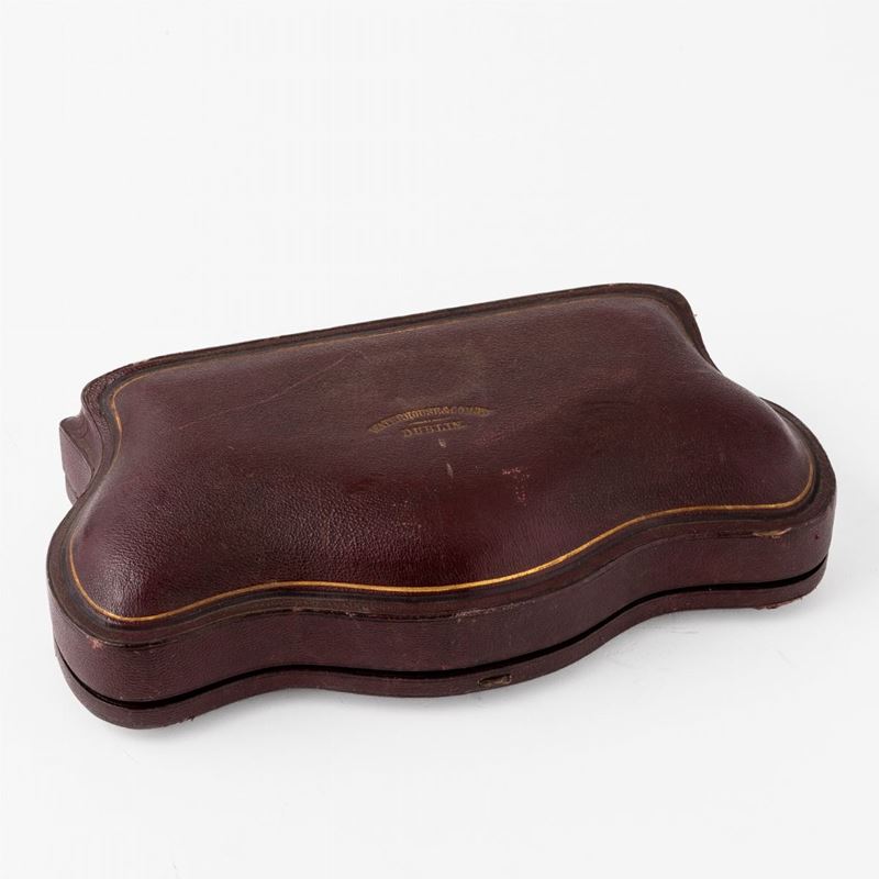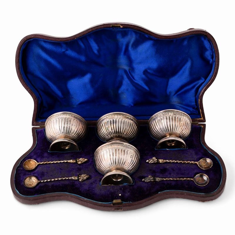 Scatola con 4 salierine e cucchiaini. Argento fuso e sagomato. Londra 1873, argentiere R.R (non identificato)