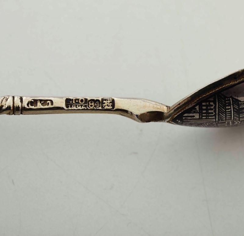 Set di cucchiaini. Argento fuso e niellato. Mosca 1896. Assaggiatore Lev Fedorovich Oleks (?). Argentiere non identificat [..]