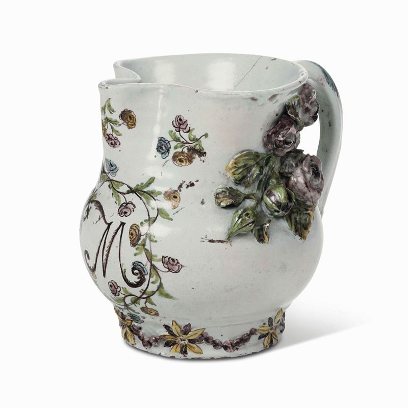 Brocca, dal ventre rigonfio e versatoio pinzato, ornata con tralci di fiori e frutti a rilievo, decorata con un filo fiorito e un’iniziale “M” maiuscola corsiva