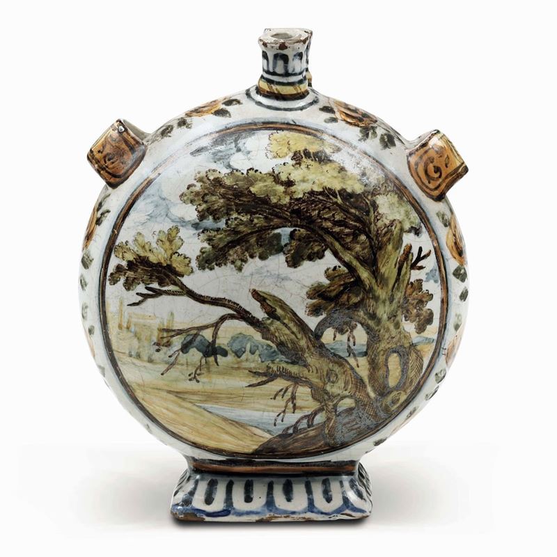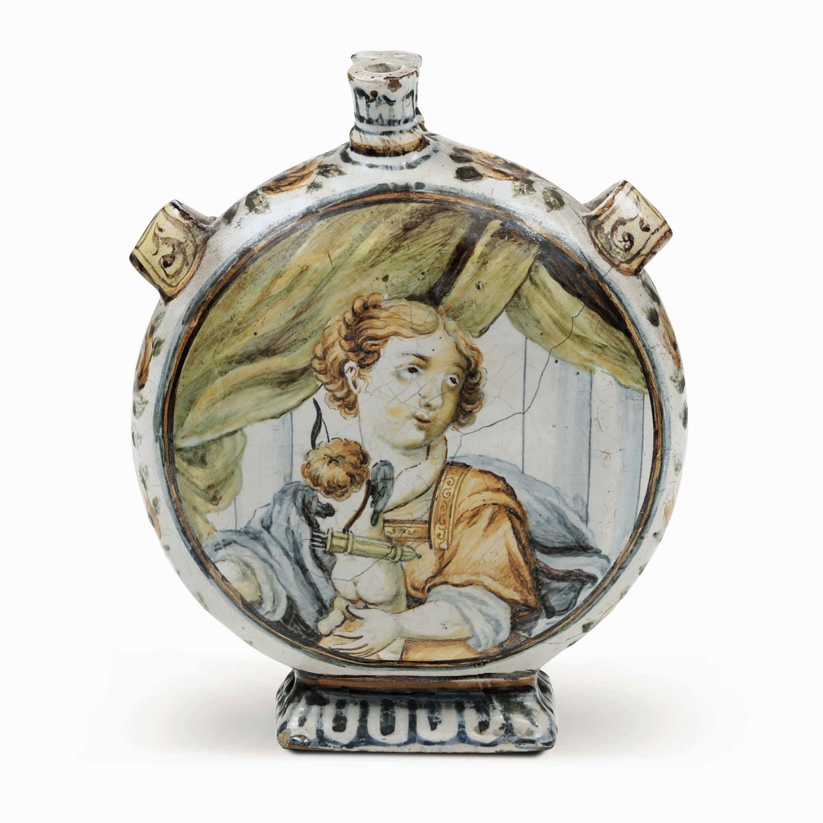 Fiasca da pellegrino Castelli, probabilmente Berardino Gentili il Vecchio, 1680 circa