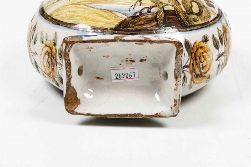 La fiasca dalla forma circolare poggia su basso piede a sezione rettangolare e porta alla sommità due beccucci cilindrici. Sullo spessore, decorato con il susseguirsi di brevi steli con grandi fiori, due anelli permettono il passaggio della corda. La decorazione vede sul recto una figura femminile con amorino, sul verso un paesaggio