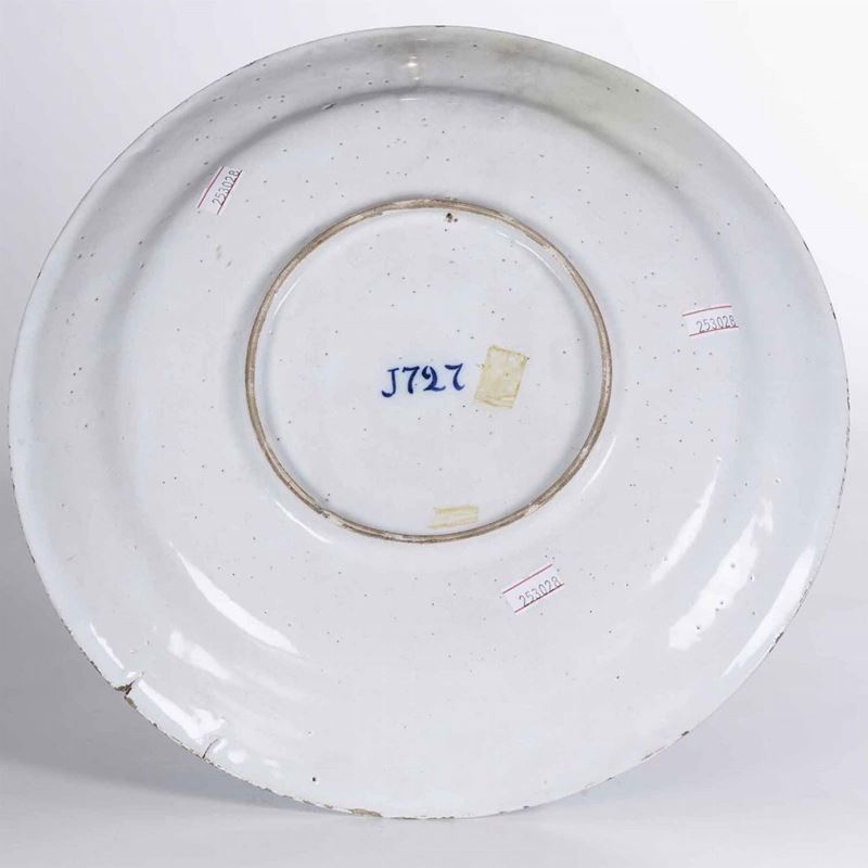 Maiolica in monocromia blu di cobalto a gran fuoco. Marca: assente; data “1727” in blu tracciata sul verso. Diametro cm 32. Conservazione: minime sbeccature al bordo