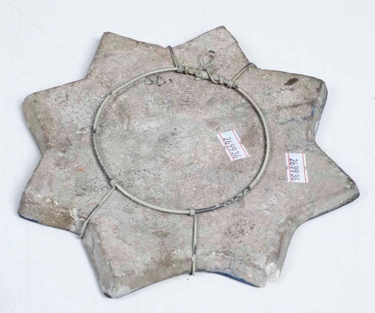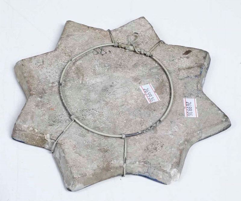Mattonella ad otto punte decorata al centro con motivi fitomorfi e al bordo scritta con verso coranico (?)
