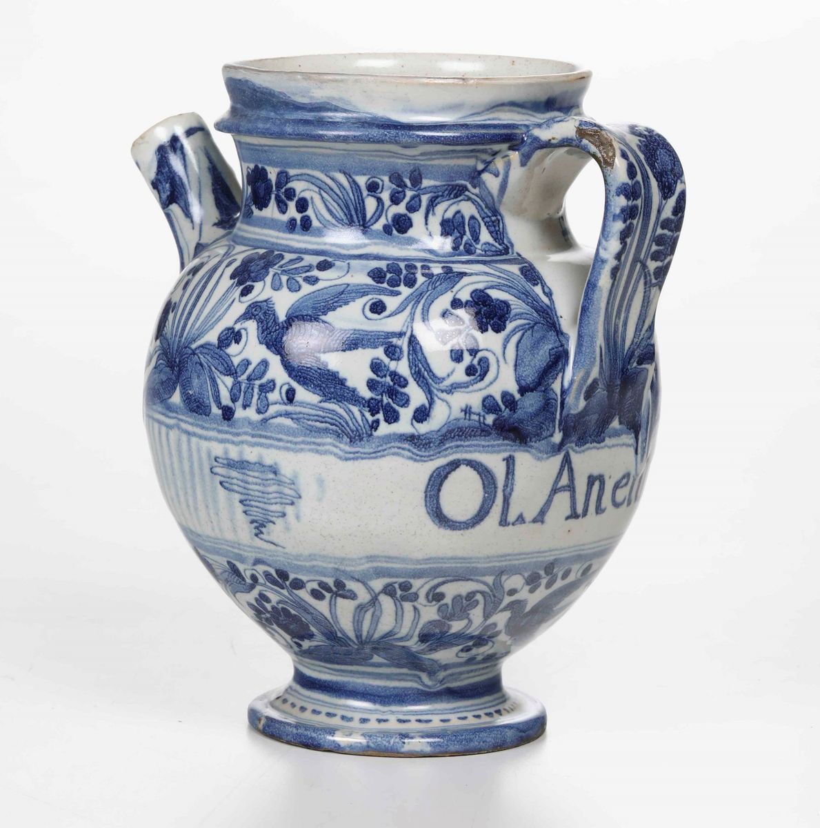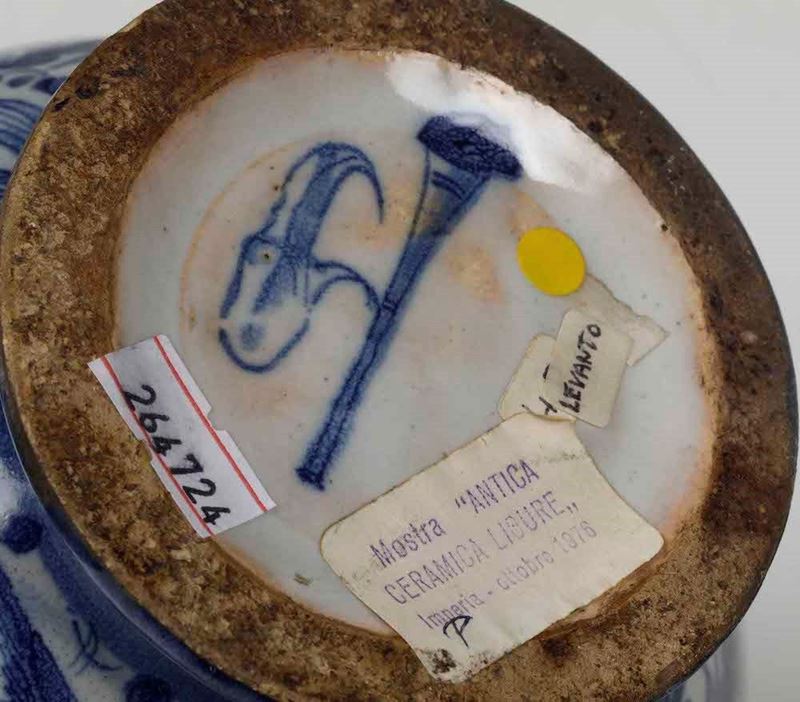 Orciolo decorato in monocromia blu di cobalto col motivo “orientalizzante” naturalistico con ciuffi fogliati e fiori, animato da uccelli in volo. Al centro taglia l’ornato la fascia apotecaria. Quest’orciolo è stato esposto nel 1976 a Imperia alla mostra “Antica Ceramica Ligure”, come risulta dall’etichetta cartacea posta sotto la base