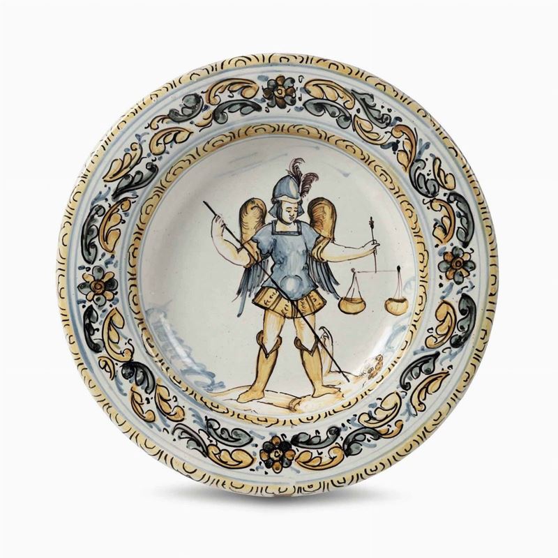 Piatto con ampio cavetto entro cui campeggia la figura di San Michele Arcangelo su fondo bianco, caratterizzato dagli attributi canonici della bilancia e della lancia con cui trafigge il diavolo, qui raffigurato ai suoi piedi, in atto di puntare l’artiglio di una mano alla gamba del santo